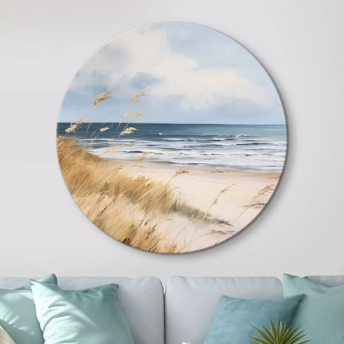 Кругла картина Піщаний пляж з високою травою на передньому плані, океан з хвилями і хмарне небо на задньому плані r45174