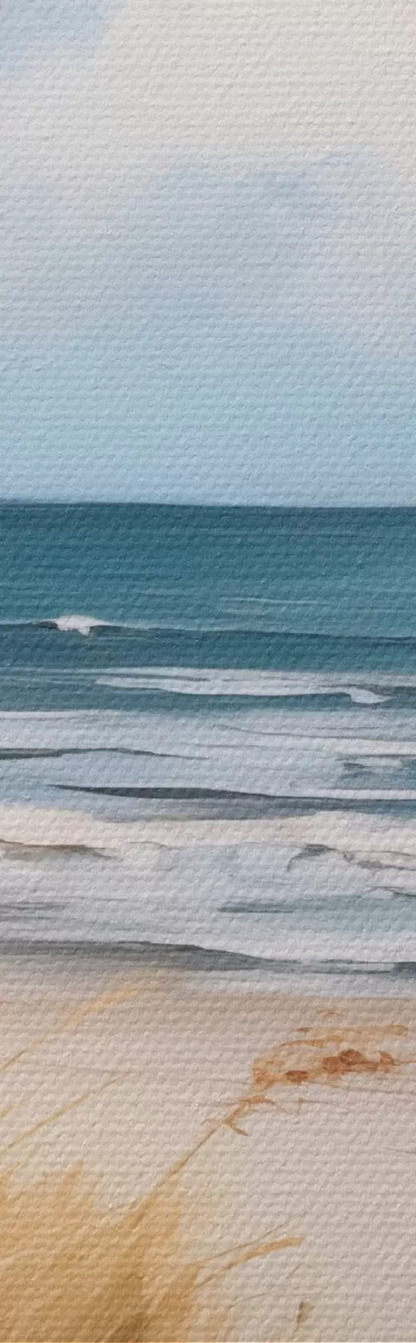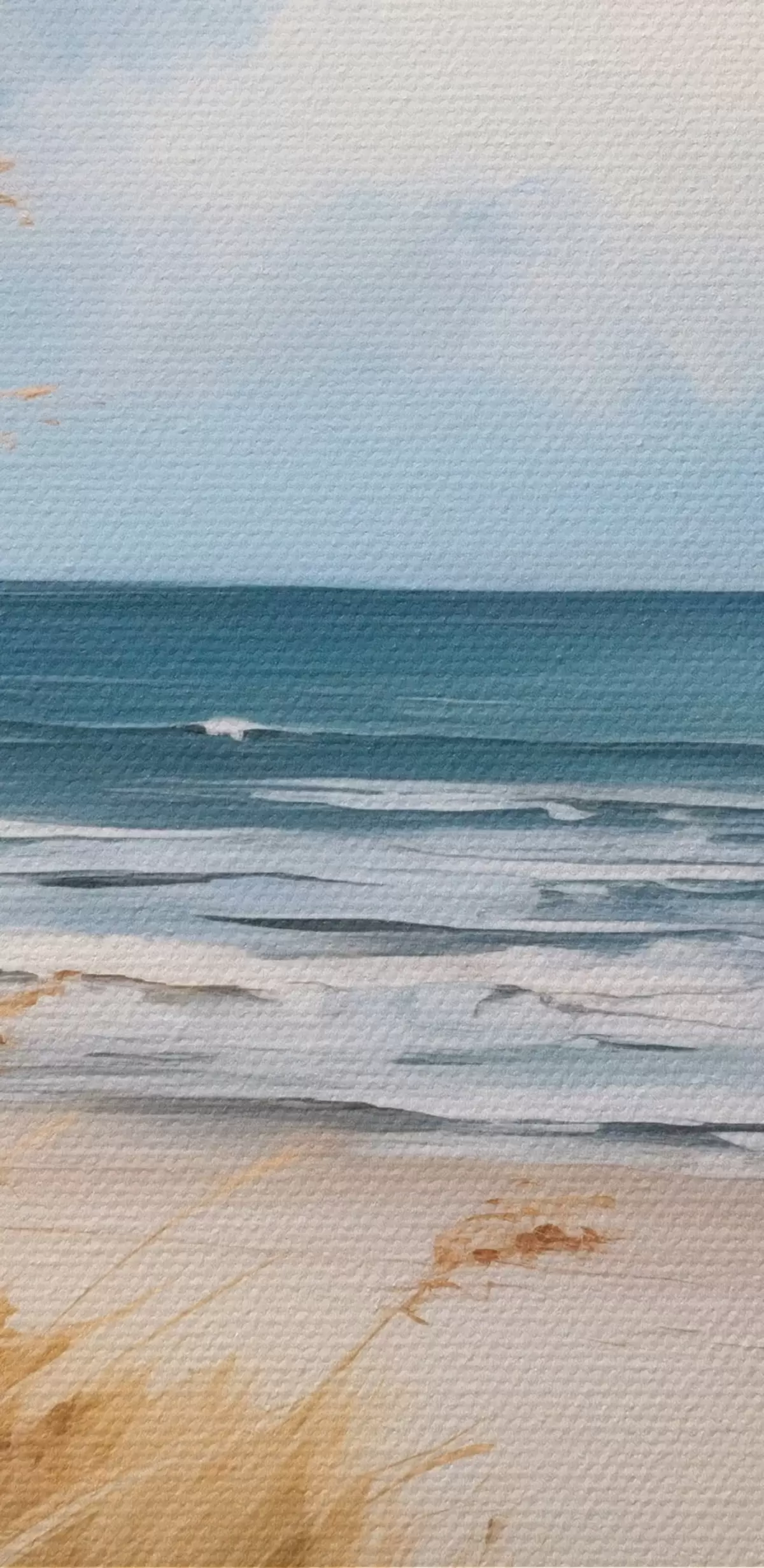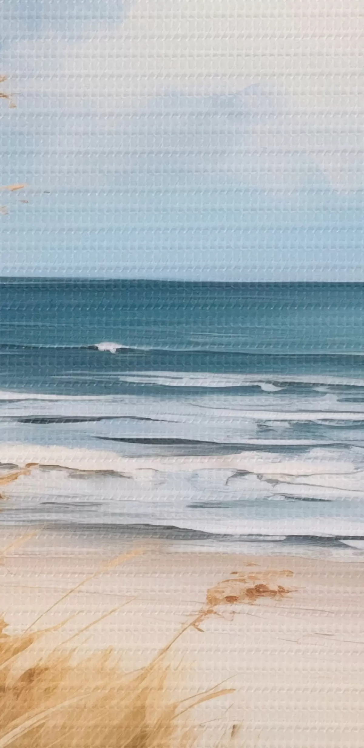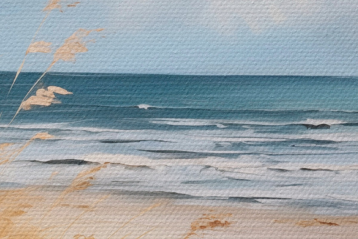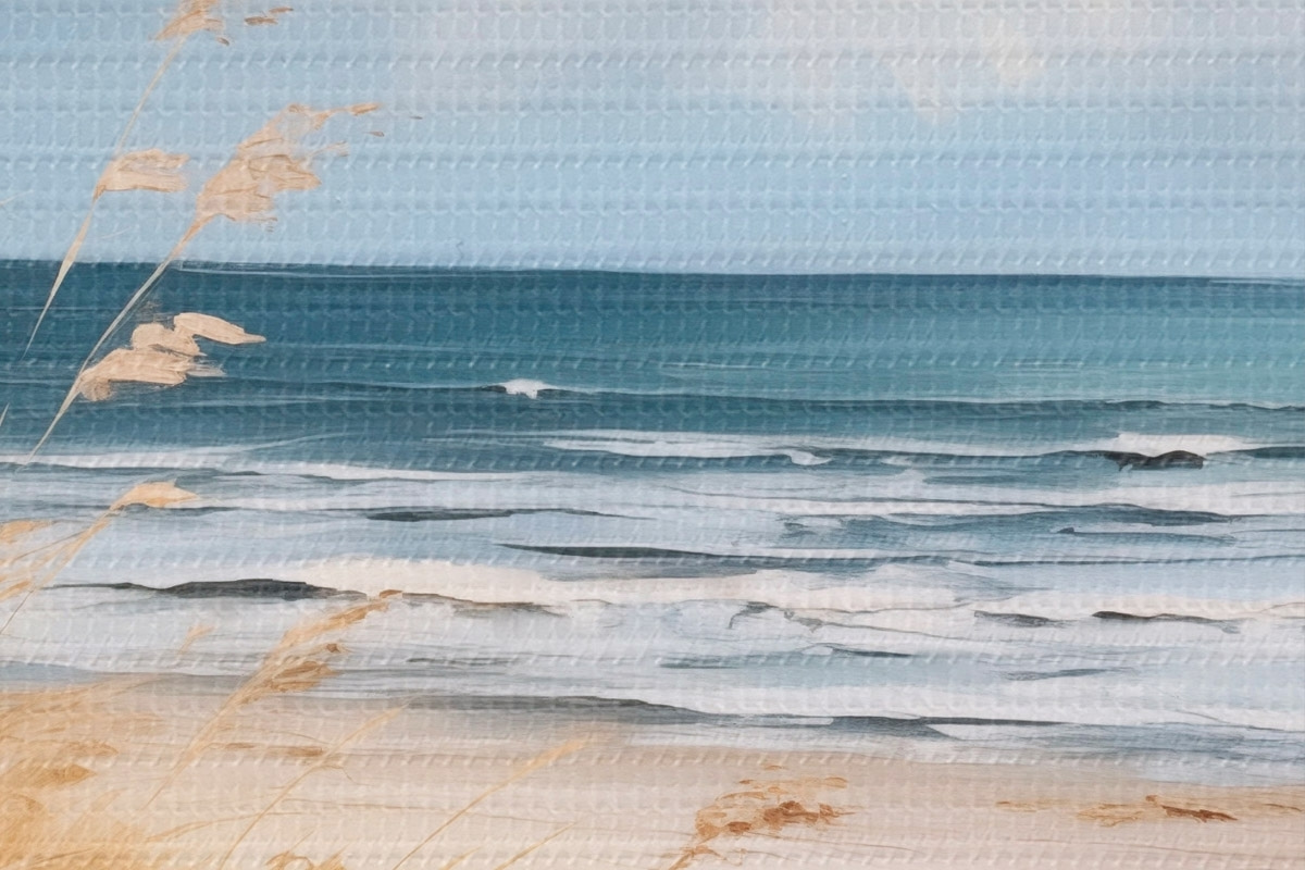 Кругла картина Піщаний пляж з високою травою на передньому плані, океан з хвилями і хмарне небо на задньому плані Nr r45174