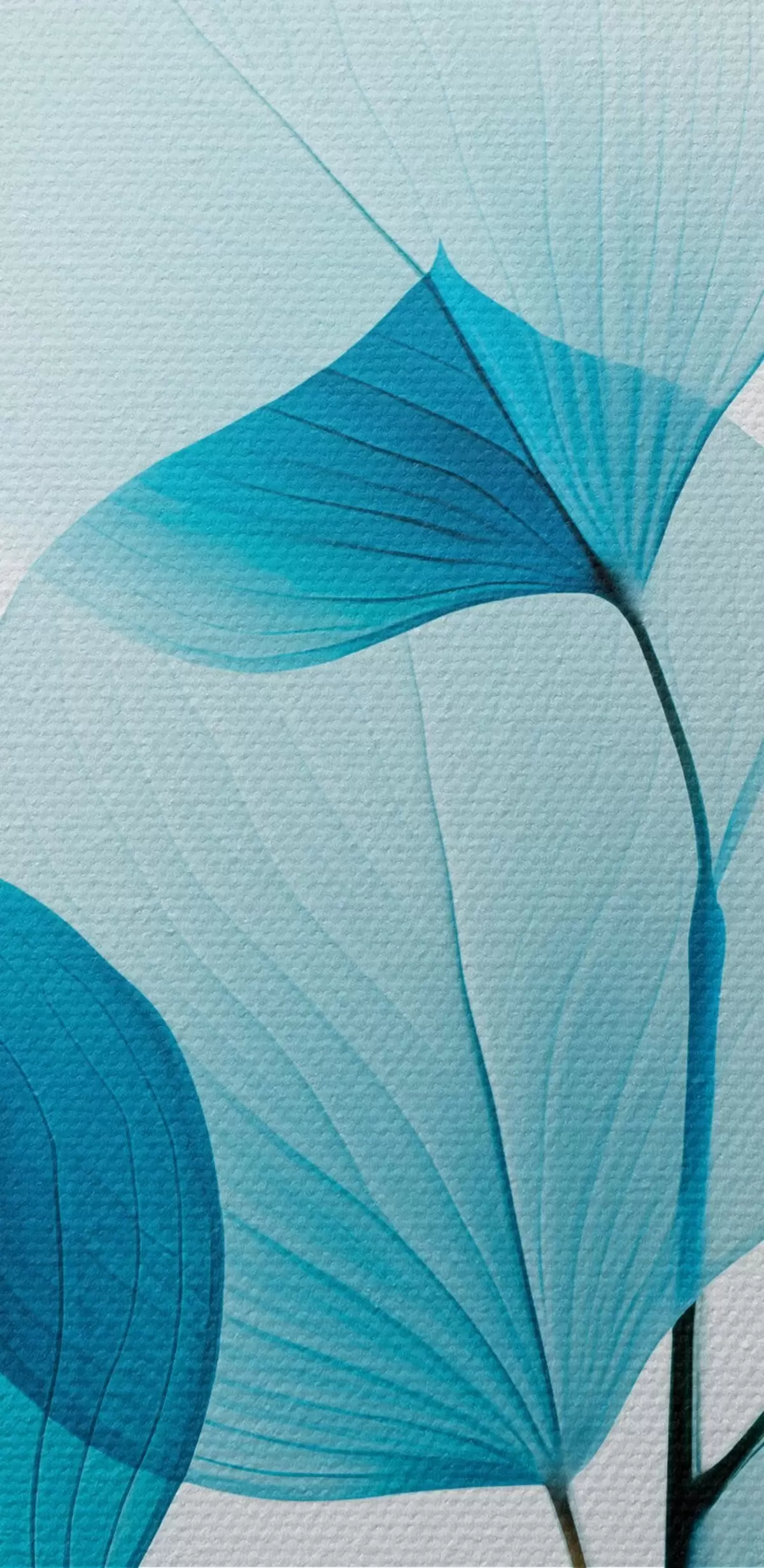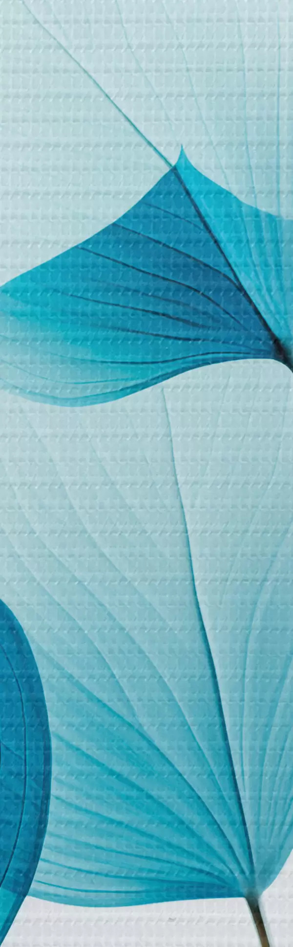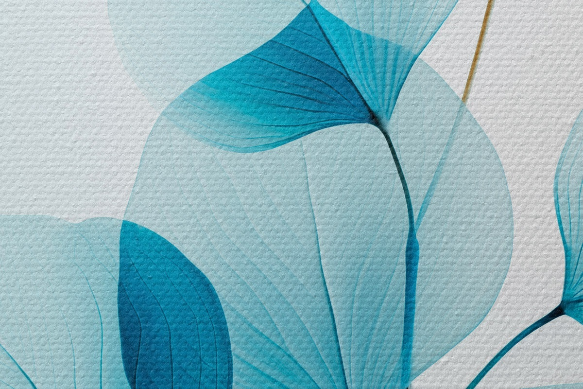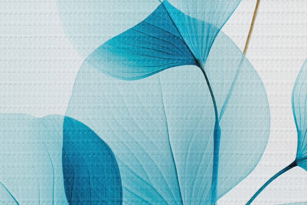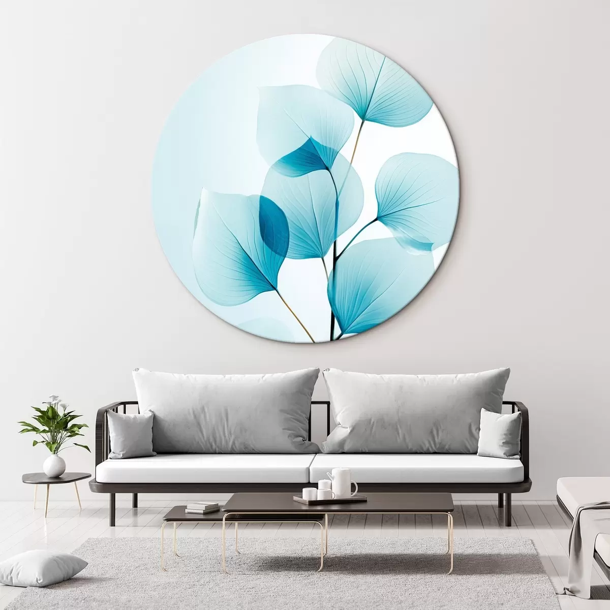 Кругла картина Гілка з напівпрозорим блакитним листям, видно тонкі прожилки, легка і спокійна композиція, мінімалістична естетика Nr r45175