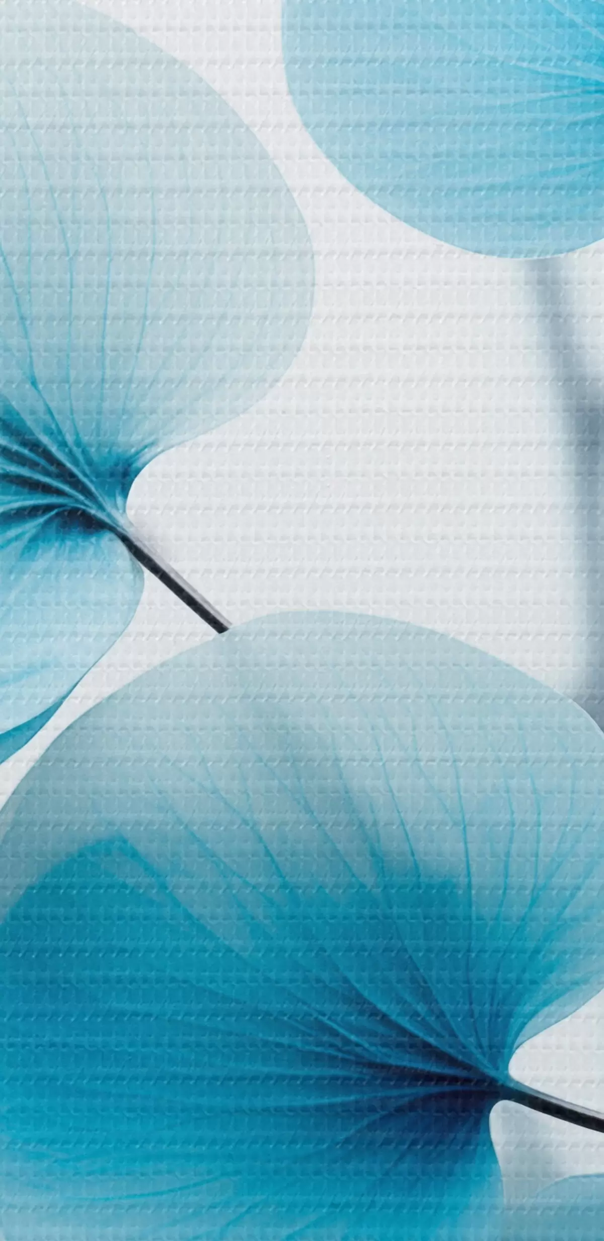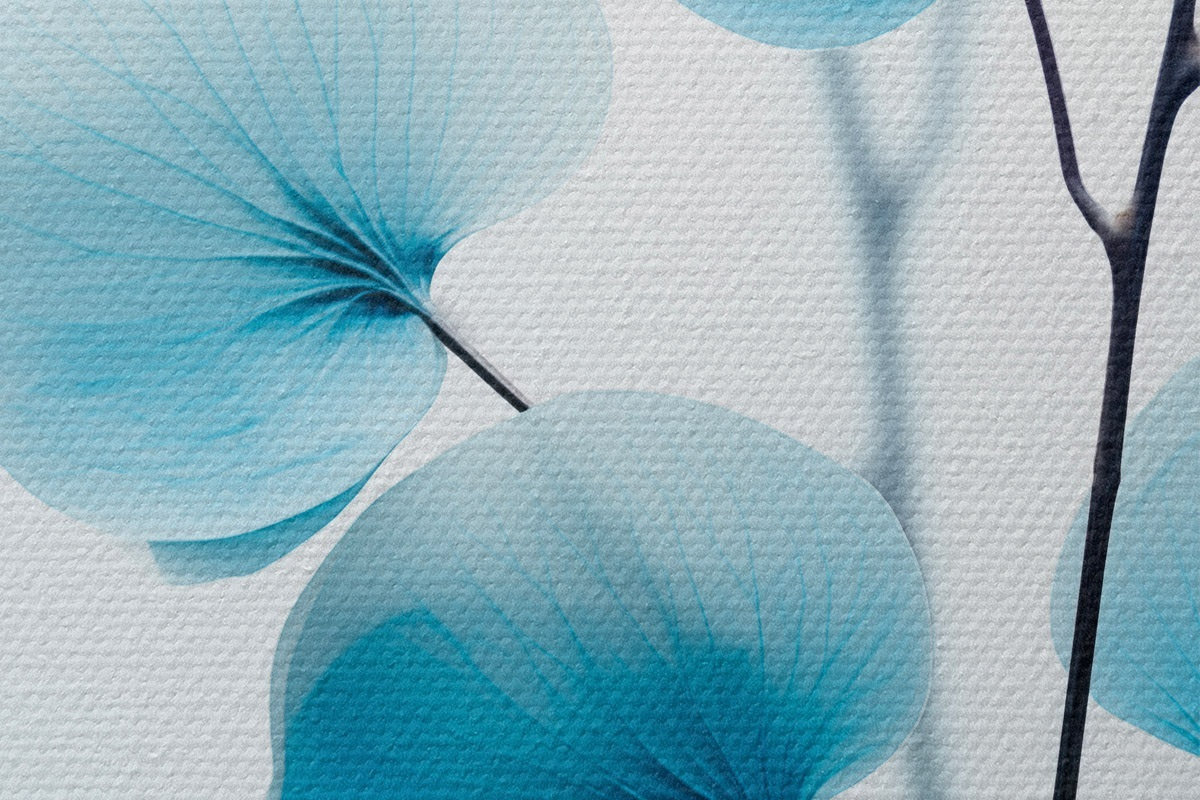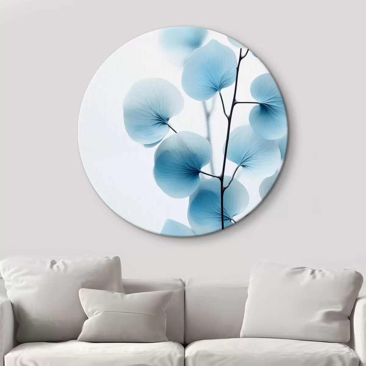 Кругла картина Гілка з напівпрозорим блакитним листям, видно тонкі прожилки, легка і спокійна композиція, мінімалістична естетика Nr r45176