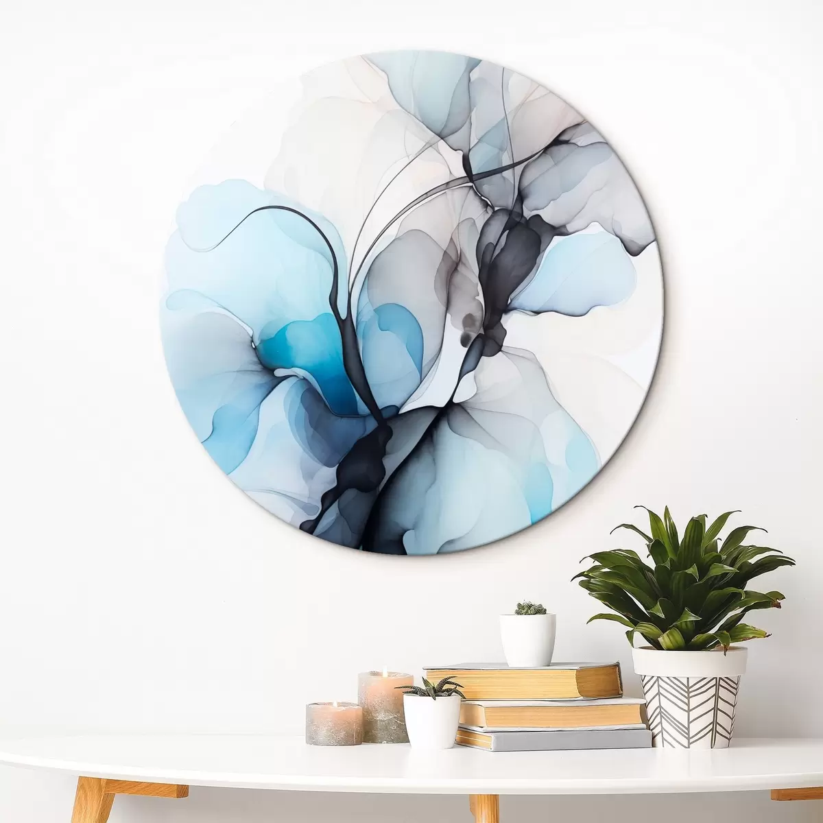Кругла картина Абстрактна композиція з плавними лініями та напівпрозорими пелюстками у відтінках синього, білого та бежевого, імітація спиртового чорнила r45177