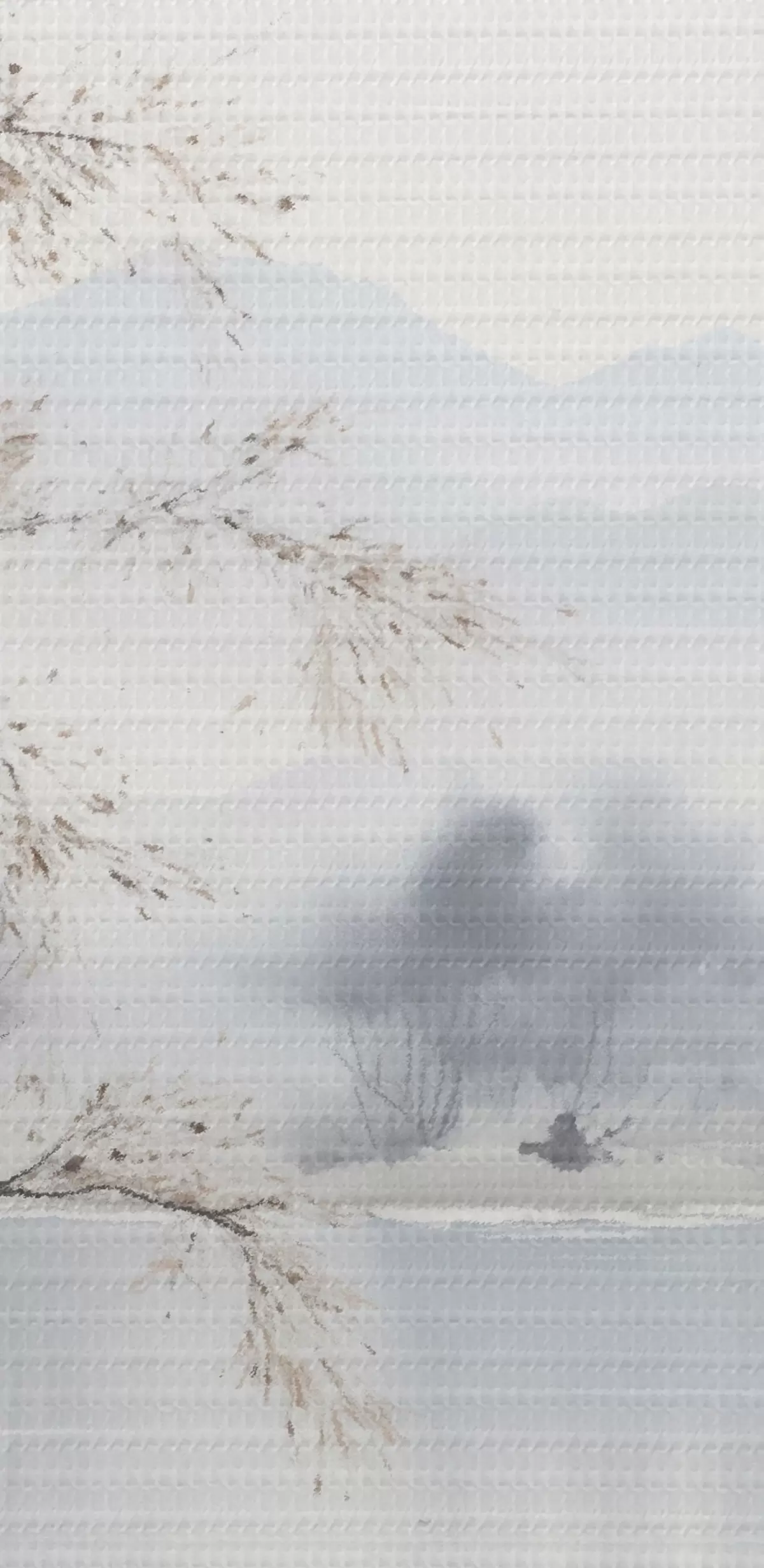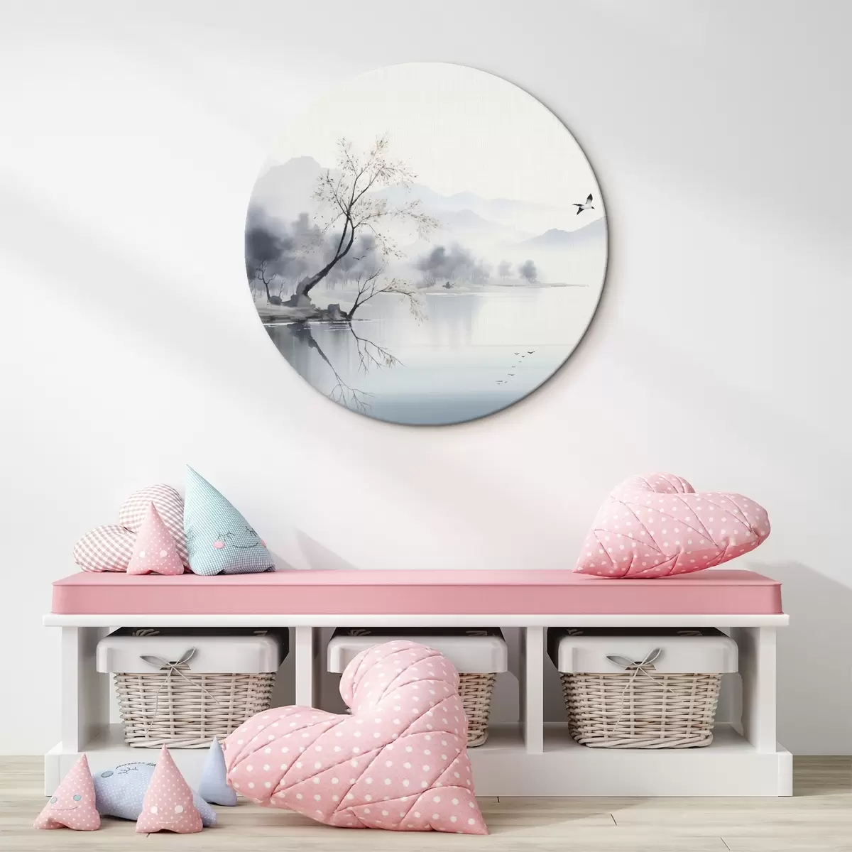 Кругла картина Туманний пейзаж з деревом, горами та птахами Nr r45518