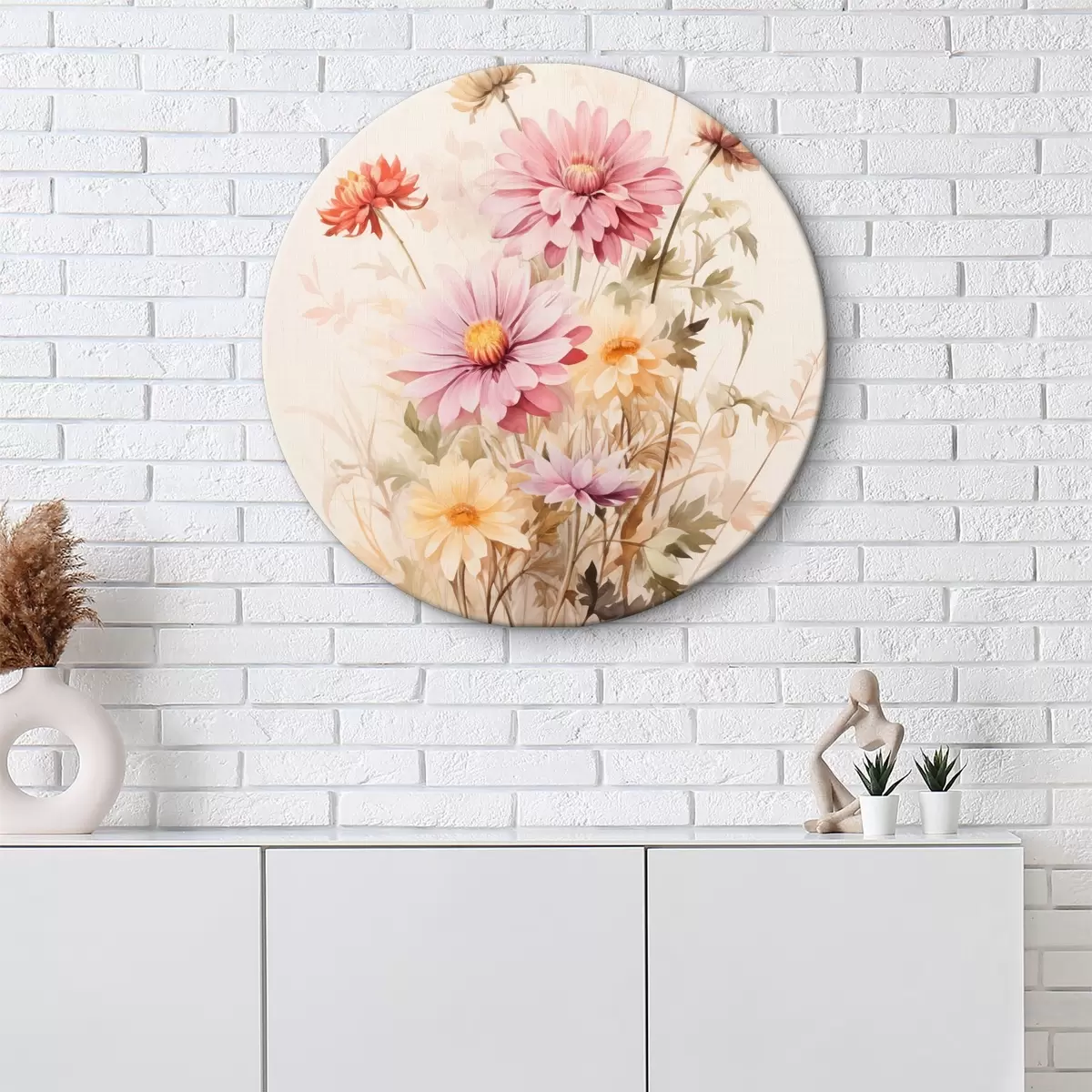 Кругла картина Букет різнокольорових квітів, м'який акварельний стиль, на світлому тлі, ботанічна ілюстрація r45560