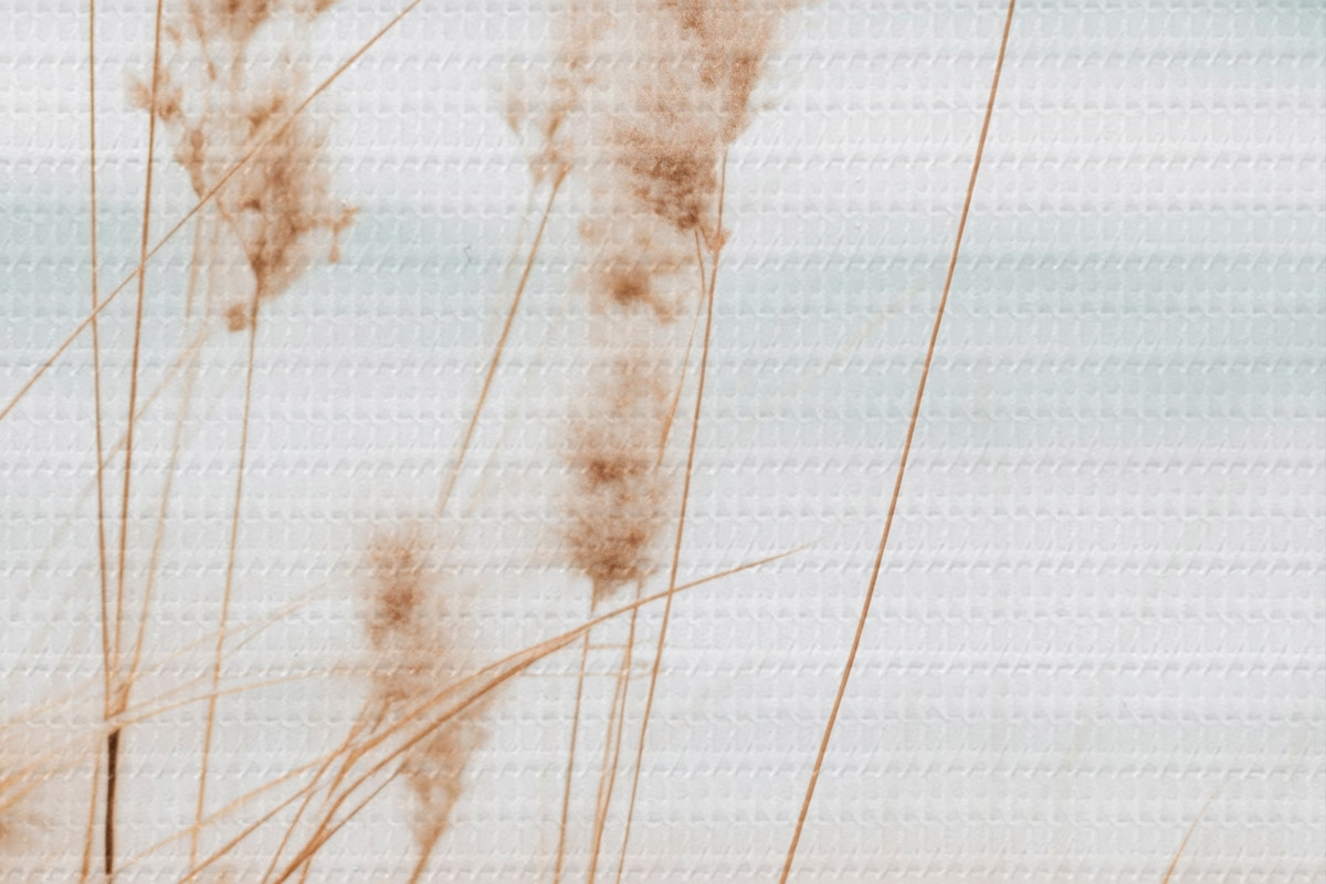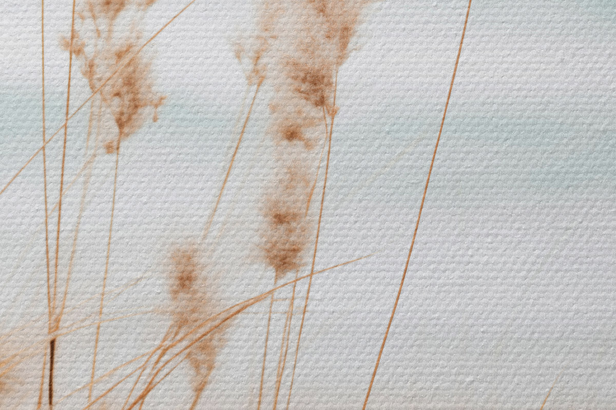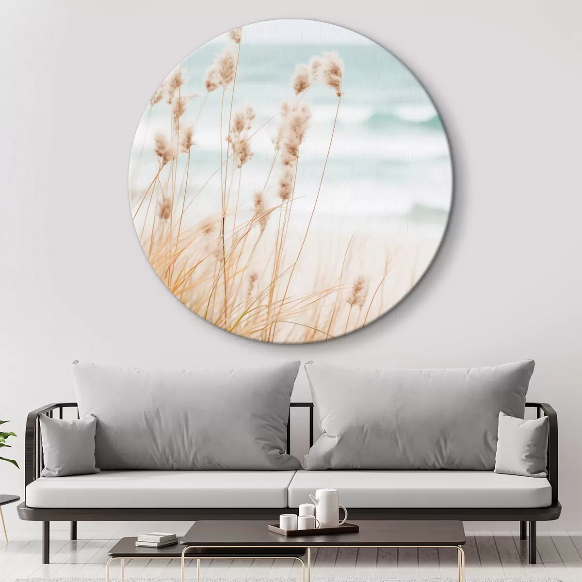 Кругла картина Висока трава з пухнастими насінням, піщаний пляж і океанські хвилі на задньому плані, м'яка і приглушена кольорова гама Nr r45561