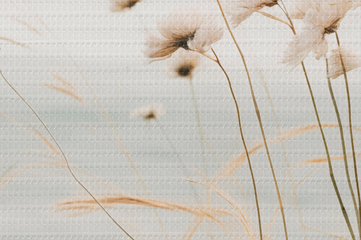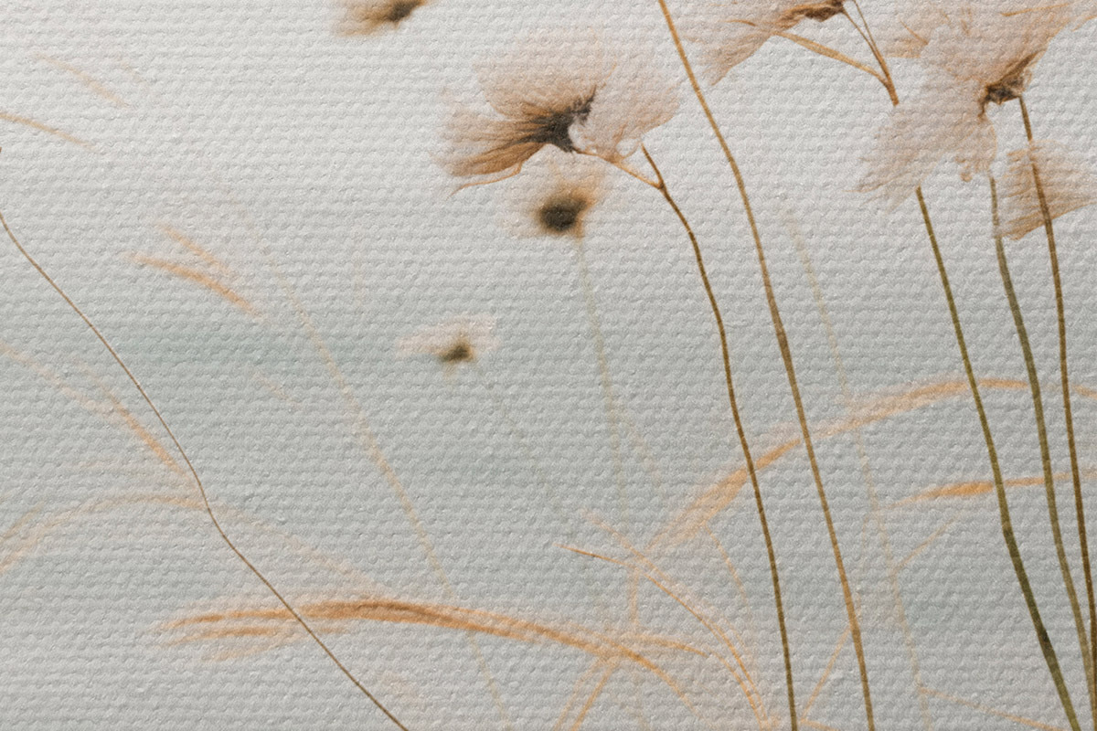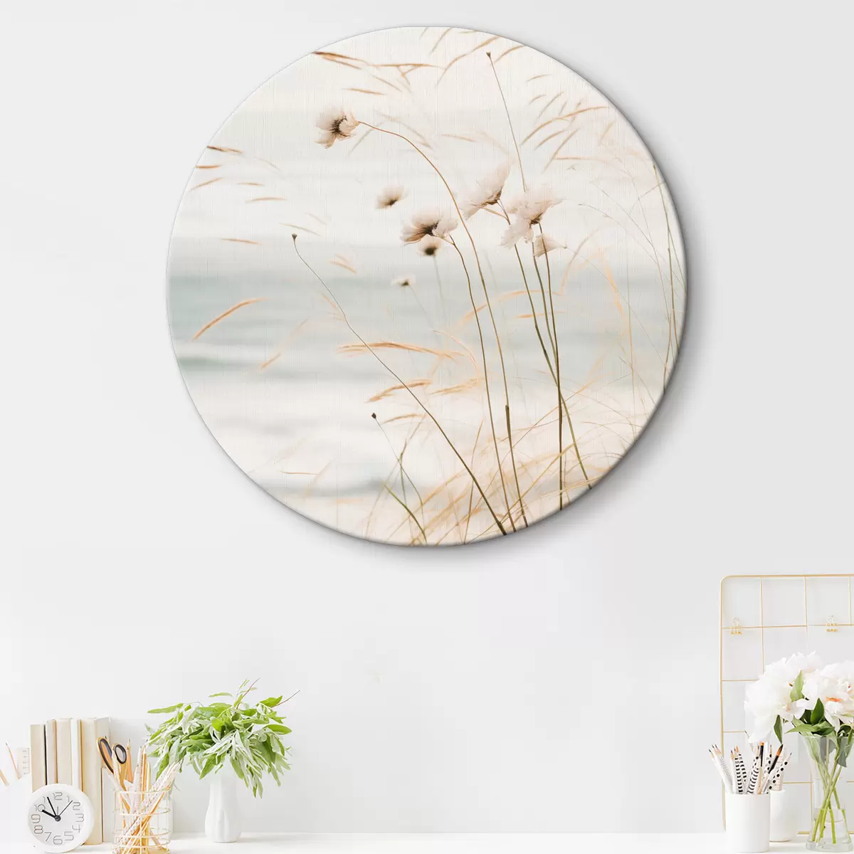Кругла картина Трохи бавовнику та іншої сухої трави на тлі розмитого моря, м'яка і приглушена кольорова палітра Nr r45562
