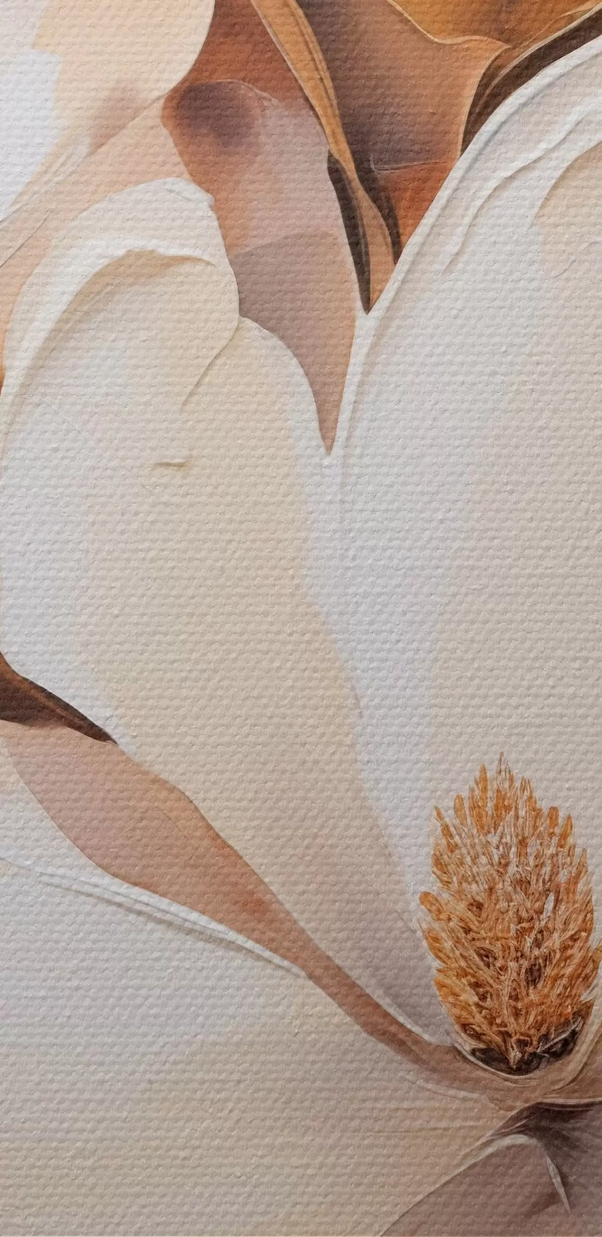Кругла картина Білі квіти магнолії на м'якому, розмитому тлі бежевих і коричневих тонів, стиль живопису Nr r45572