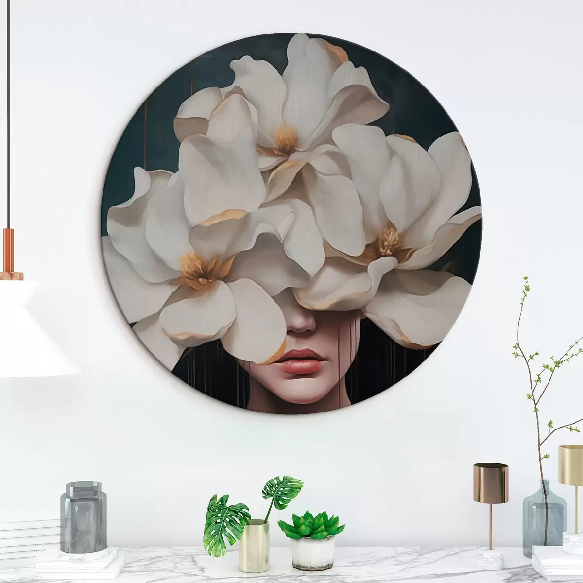 Кругла картина Жінка з білими квітами на голові r45843