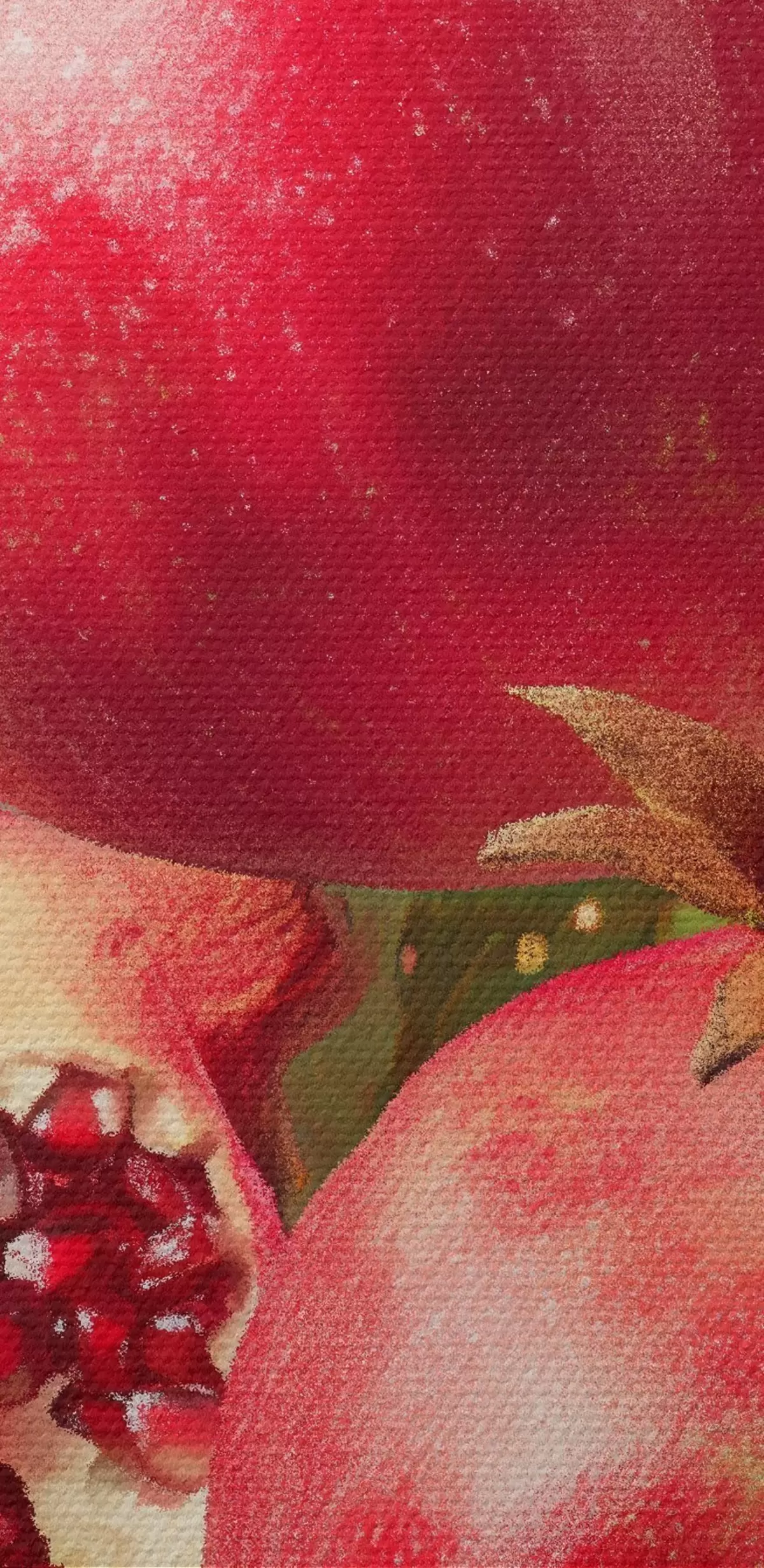 Кругла картина Зрілі гранати на рожевому тлі з листям і плямами r45868