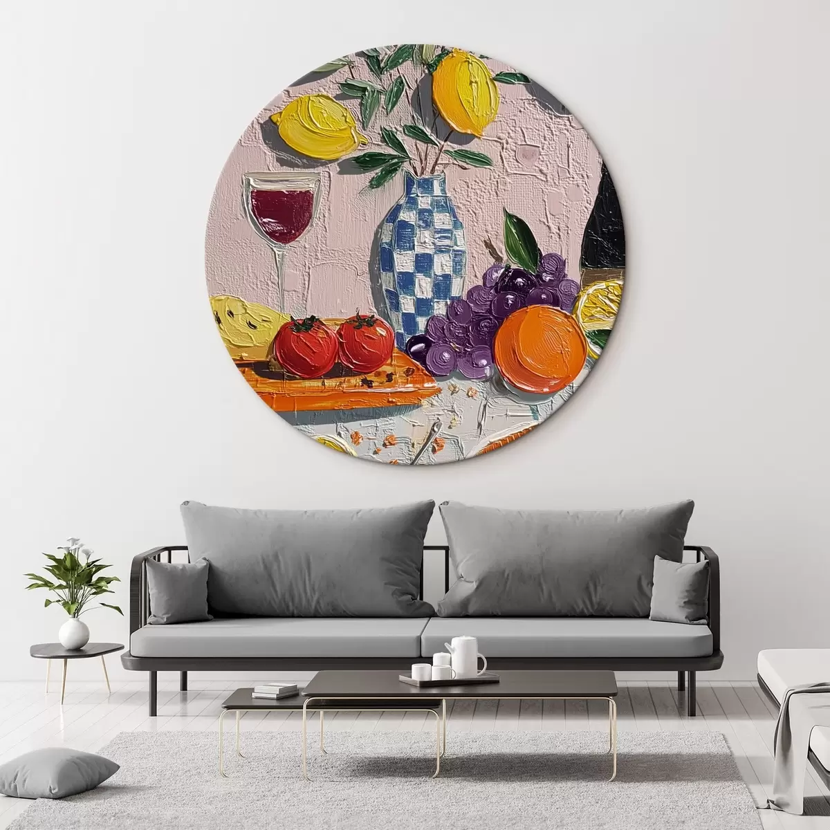 Кругла картина Пастельний натюрморт: лимони, виноград і помідори, імпасто Nr r45876