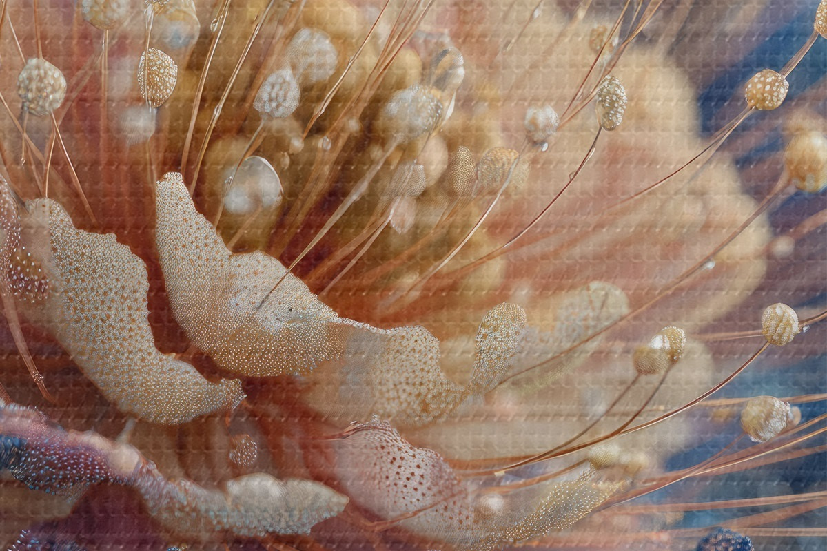 Кругла картина Перламутровий квітка з краплями роси, персиково-блакитними пелюстками r45911