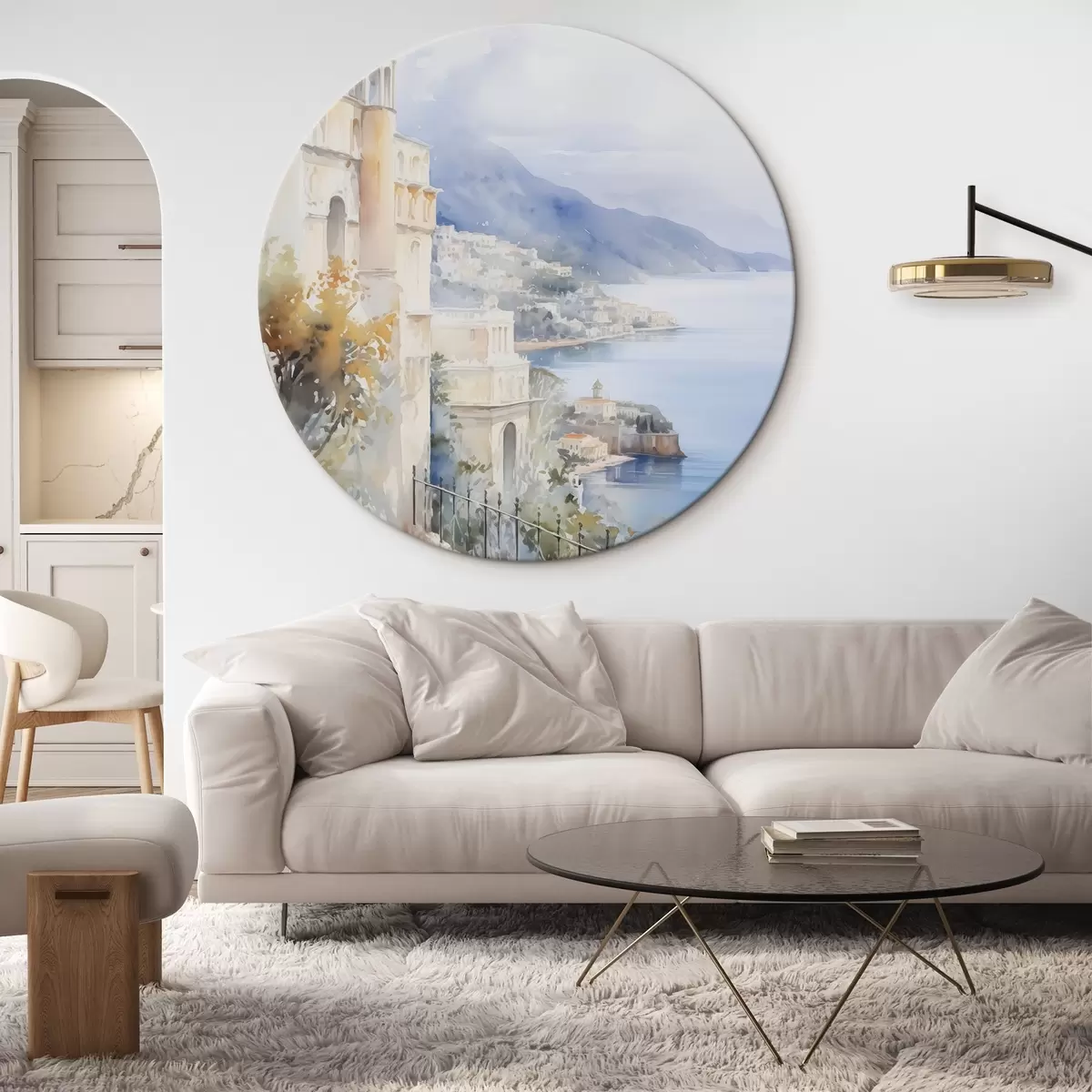 Кругла картина Затока біля міста імітація акварелі r45979