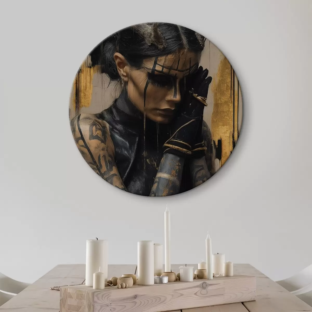 Кругла картина Жінка з рогами в темному образі з чорними лініями на обличчі Nr r46144