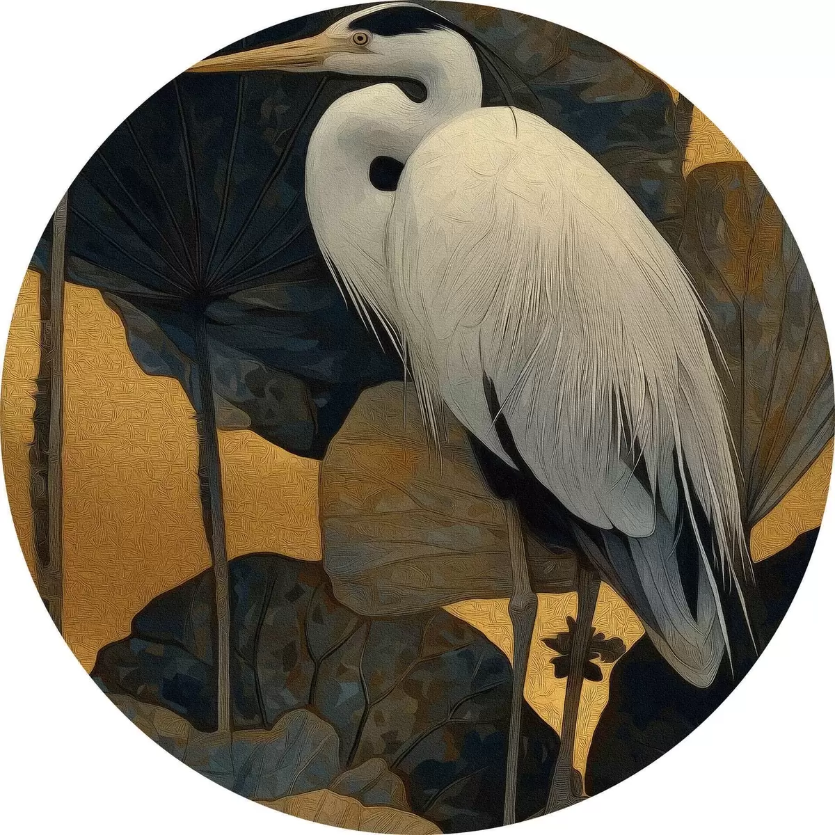 Кругла картина Біла чапля серед великих листя на теплому тлі Nr r46147