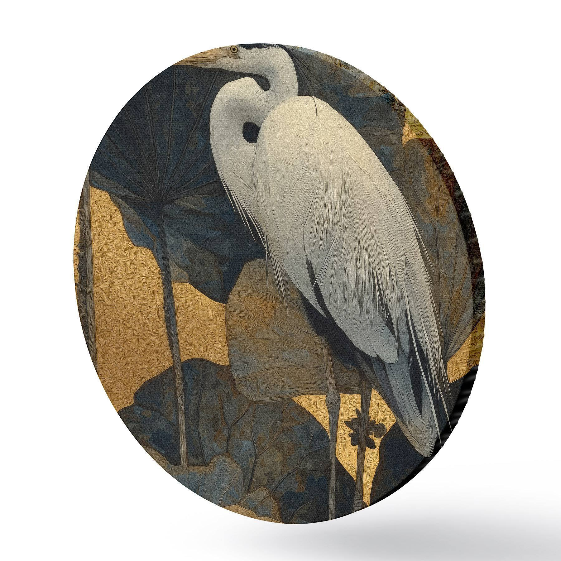 Кругла картина Біла чапля серед великих листя на теплому тлі r46147