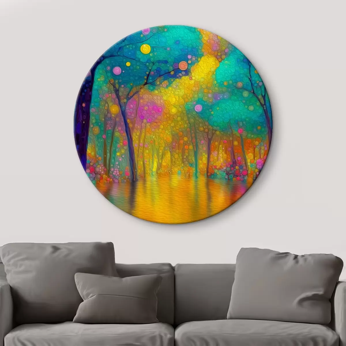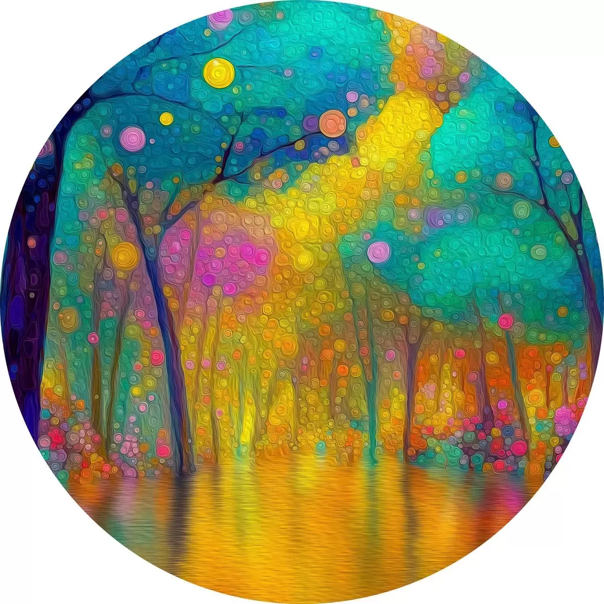 Кругла картина Яскравий фантастичний ліс з відблисками у воді Nr r46171