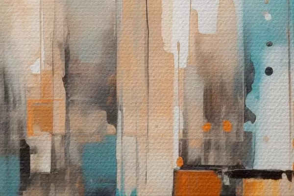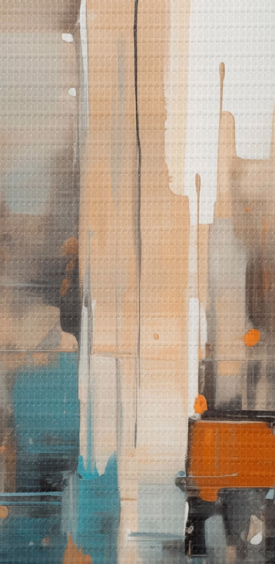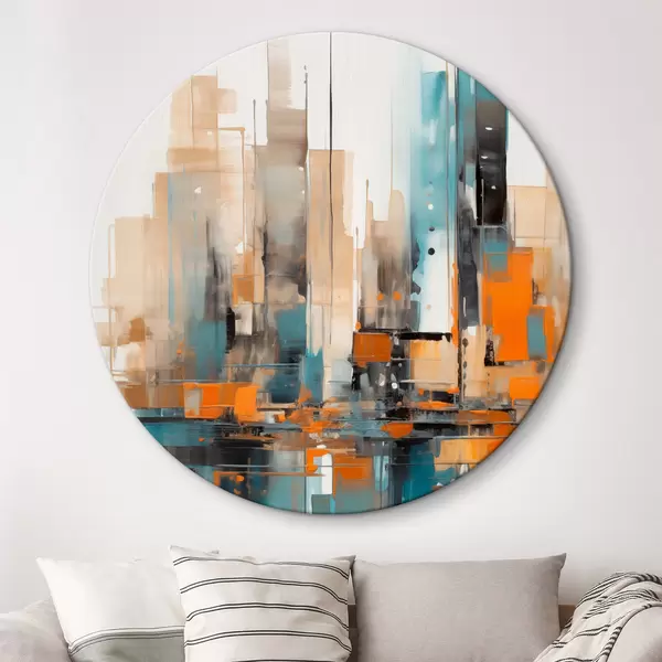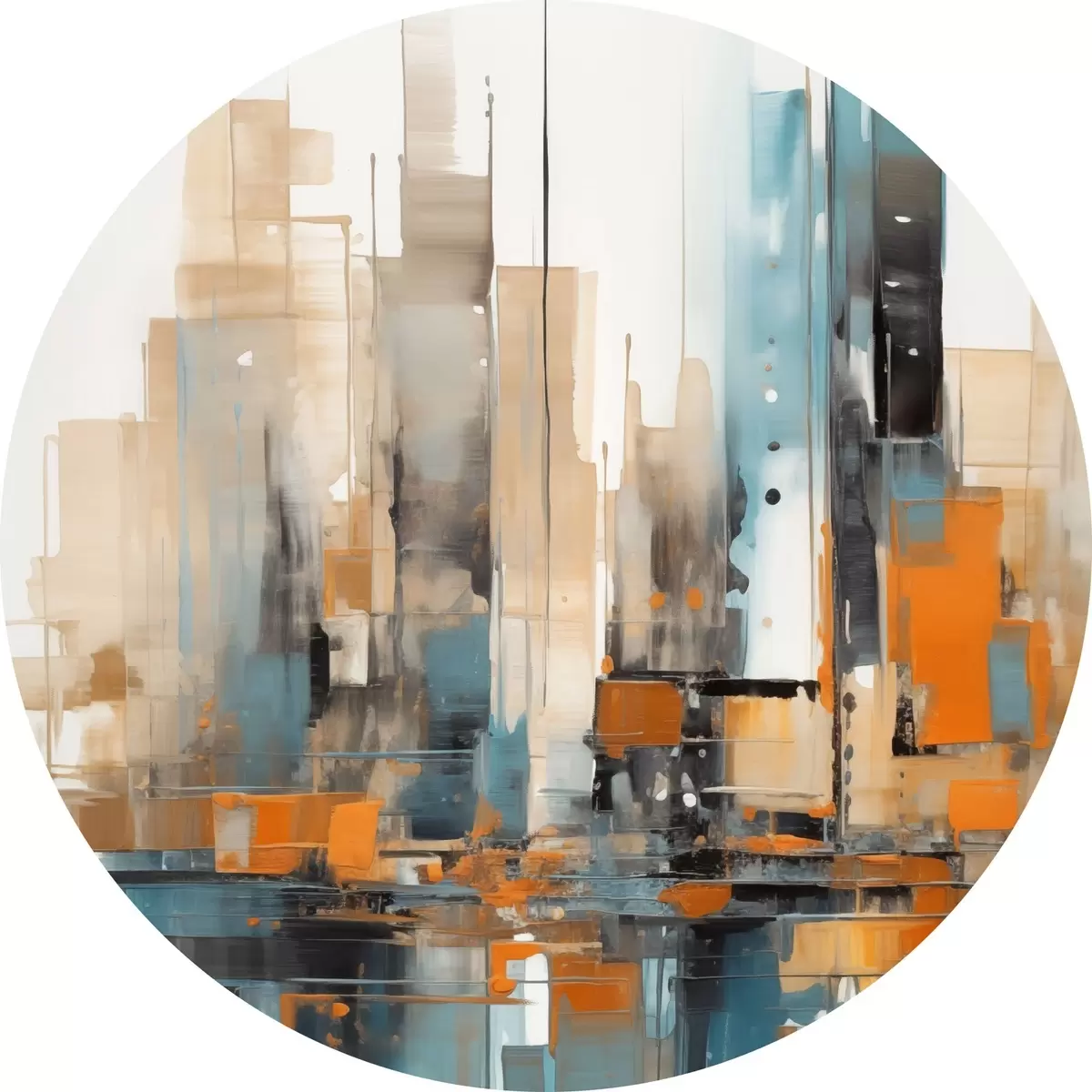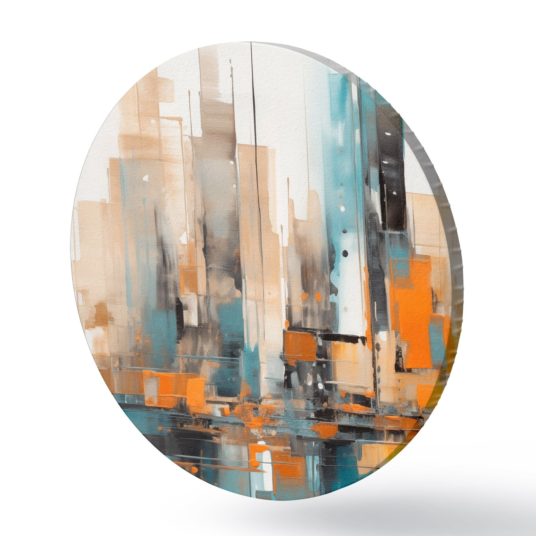 Кругла картина Абстрактний міський пейзаж з помаранчевими, бірюзовими та коричневими вертикальними мазками та геометричними фігурами Nr r46266