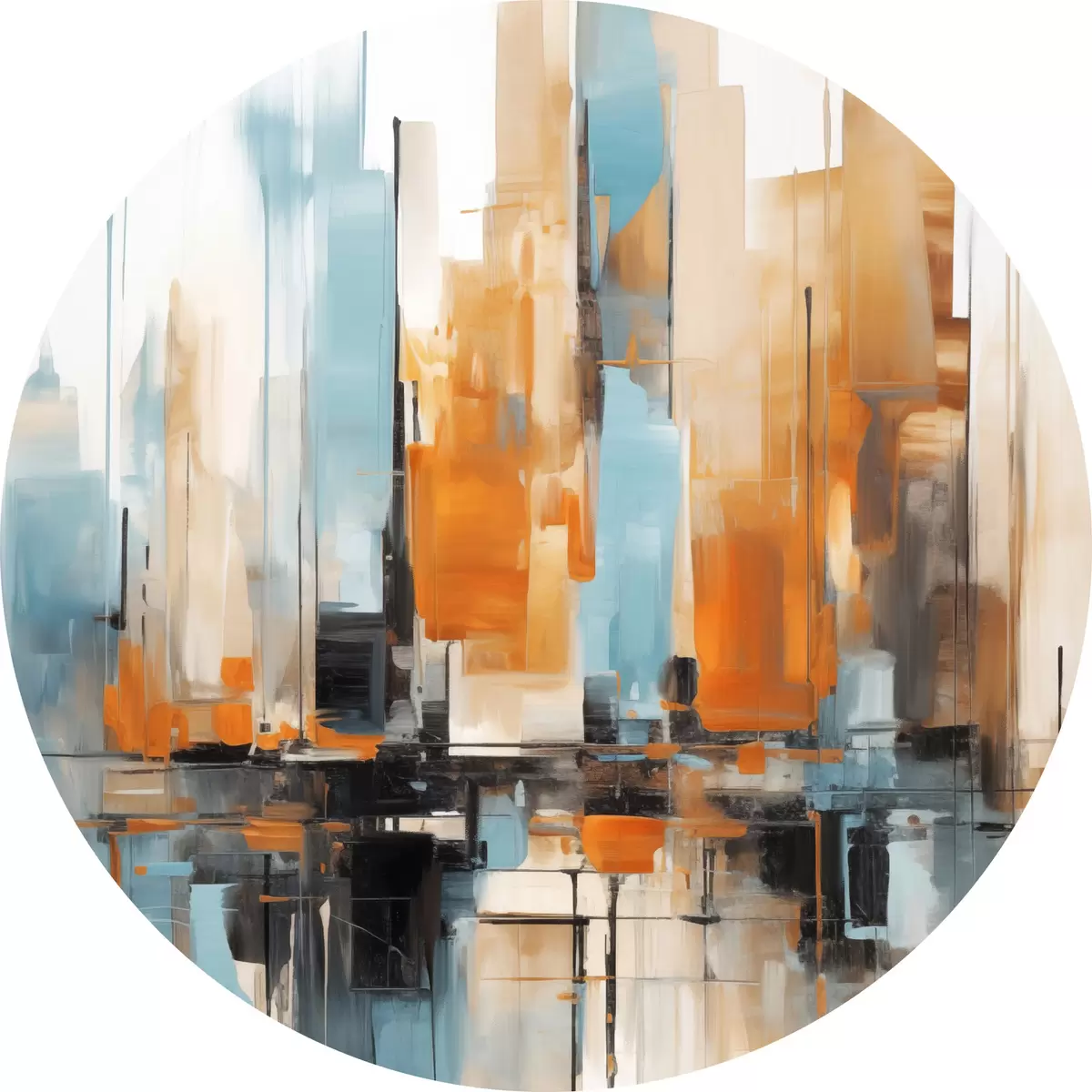 Кругла картина Абстрактний міський пейзаж з вертикальними мазками в відтінках оранжевого, синього та білого, стиль живопису r46267