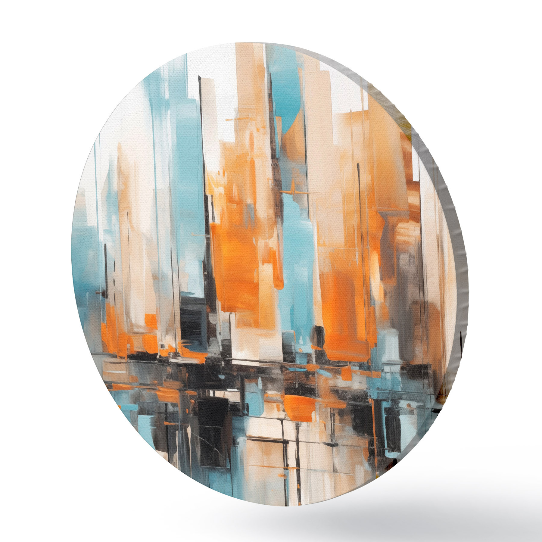 Кругла картина Абстрактний міський пейзаж з вертикальними мазками в відтінках оранжевого, синього та білого, стиль живопису Nr r46267