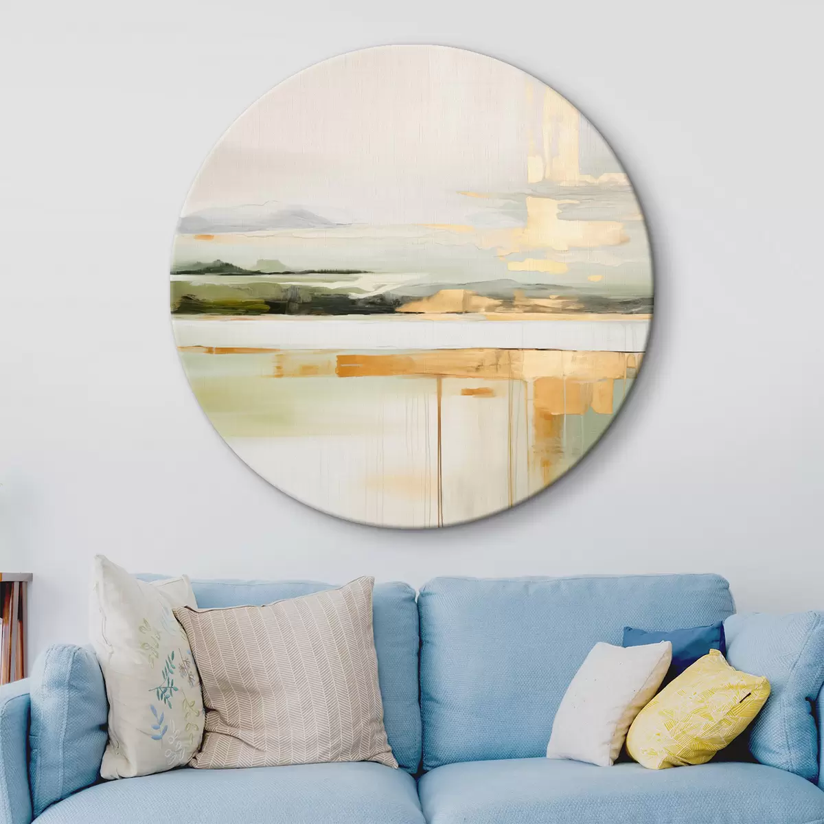 Кругла картина Абстрактний пейзаж з жовтими акцентами, мінімалістична композиція землі, води та неба, з приглушеними кольорами r46268
