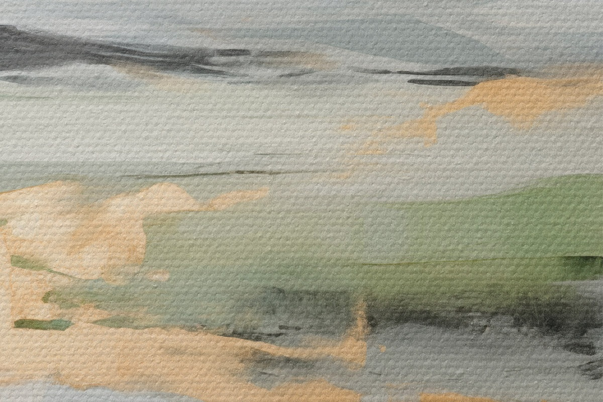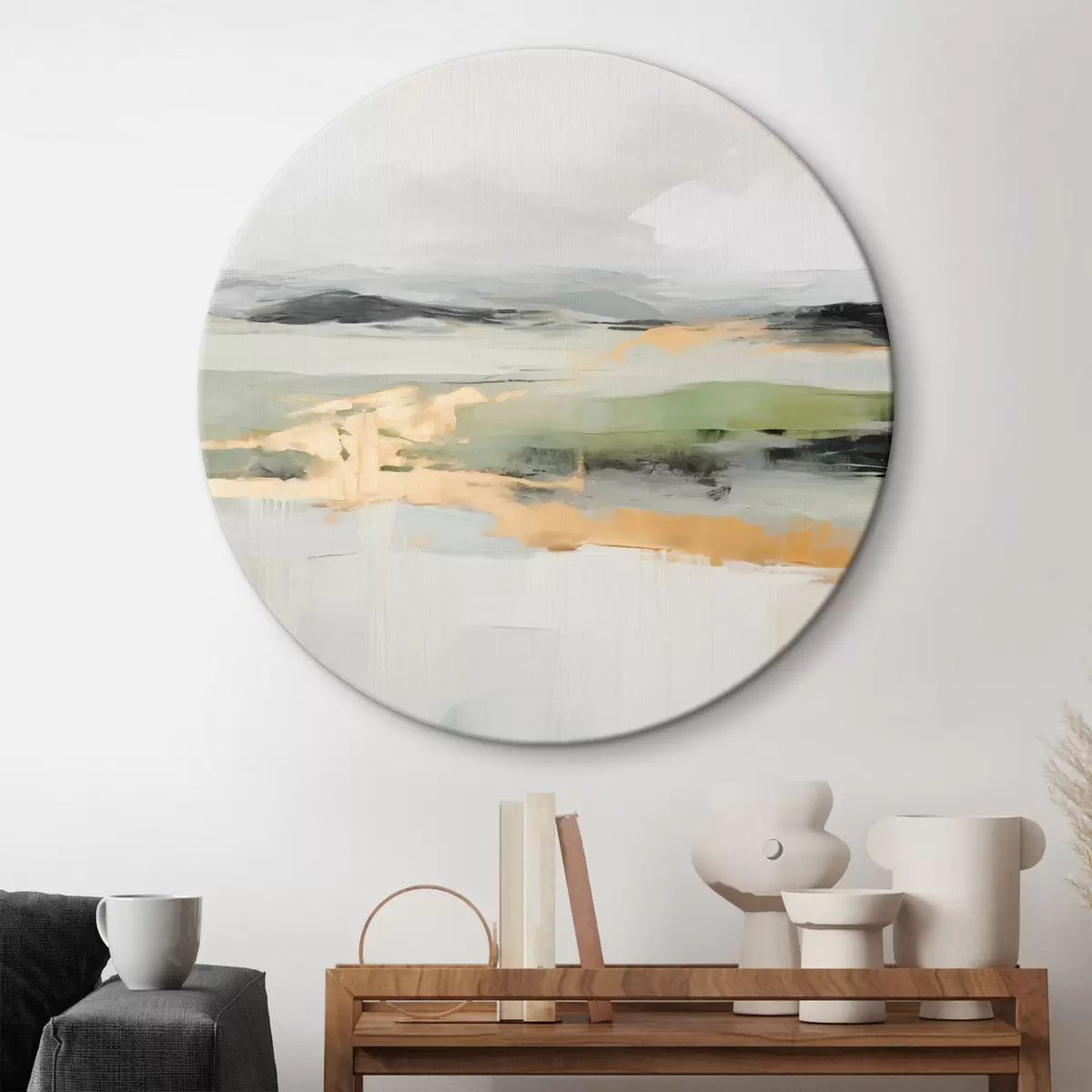 Кругла картина Абстрактний пейзаж з жовтими акцентами, мінімалістична композиція землі, води та неба, з приглушеними кольорами r46269