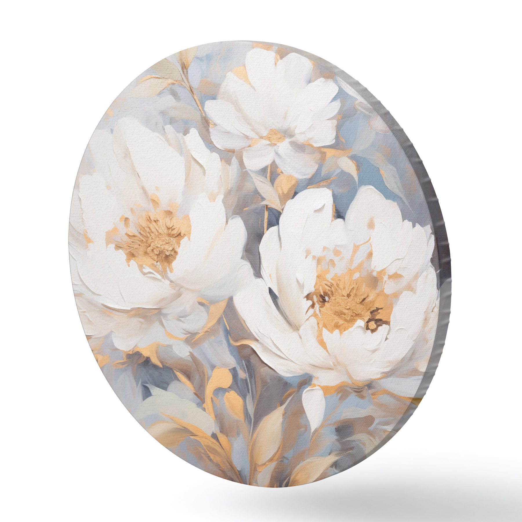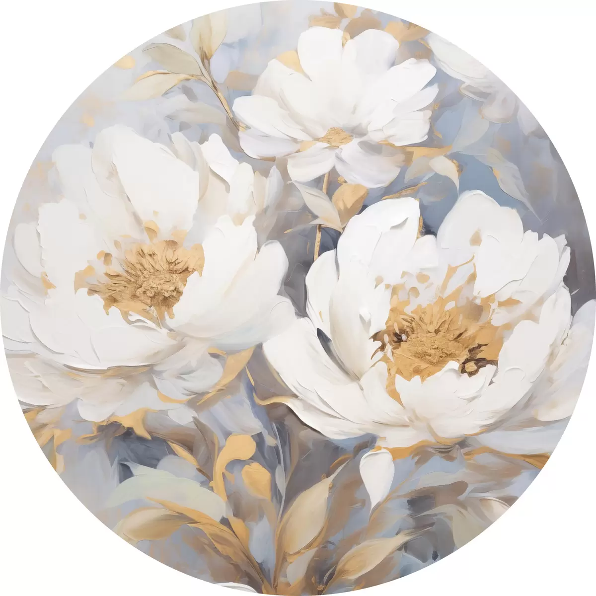 Кругла картина Білі півонії з блакитними серединками і листям, м'які мазки, світло-блакитний фон, квіткова композиція Nr r46270