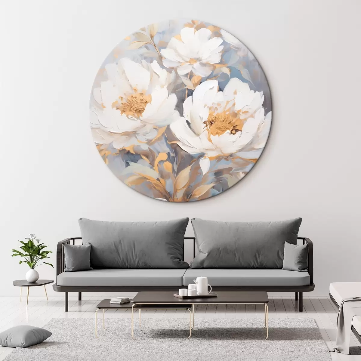 Кругла картина Білі півонії з блакитними серединками і листям, м'які мазки, світло-блакитний фон, квіткова композиція Nr r46270