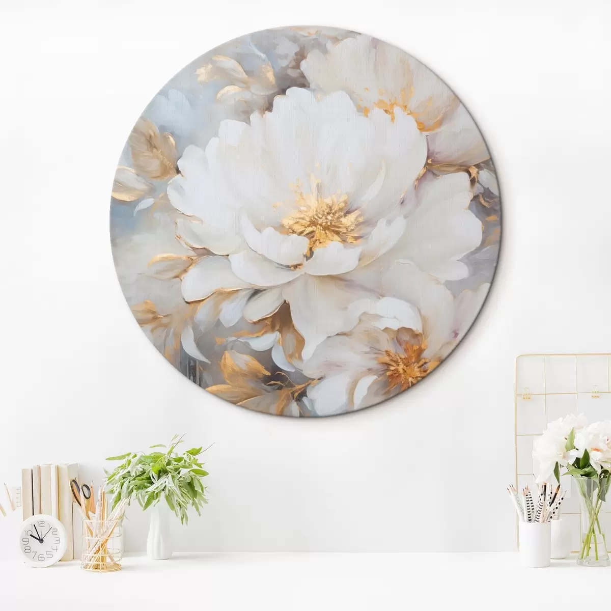 Кругла картина Білі півонії з блакитними серединками і листям, м'які мазки, світло-блакитний фон, квіткова композиція Nr r46271