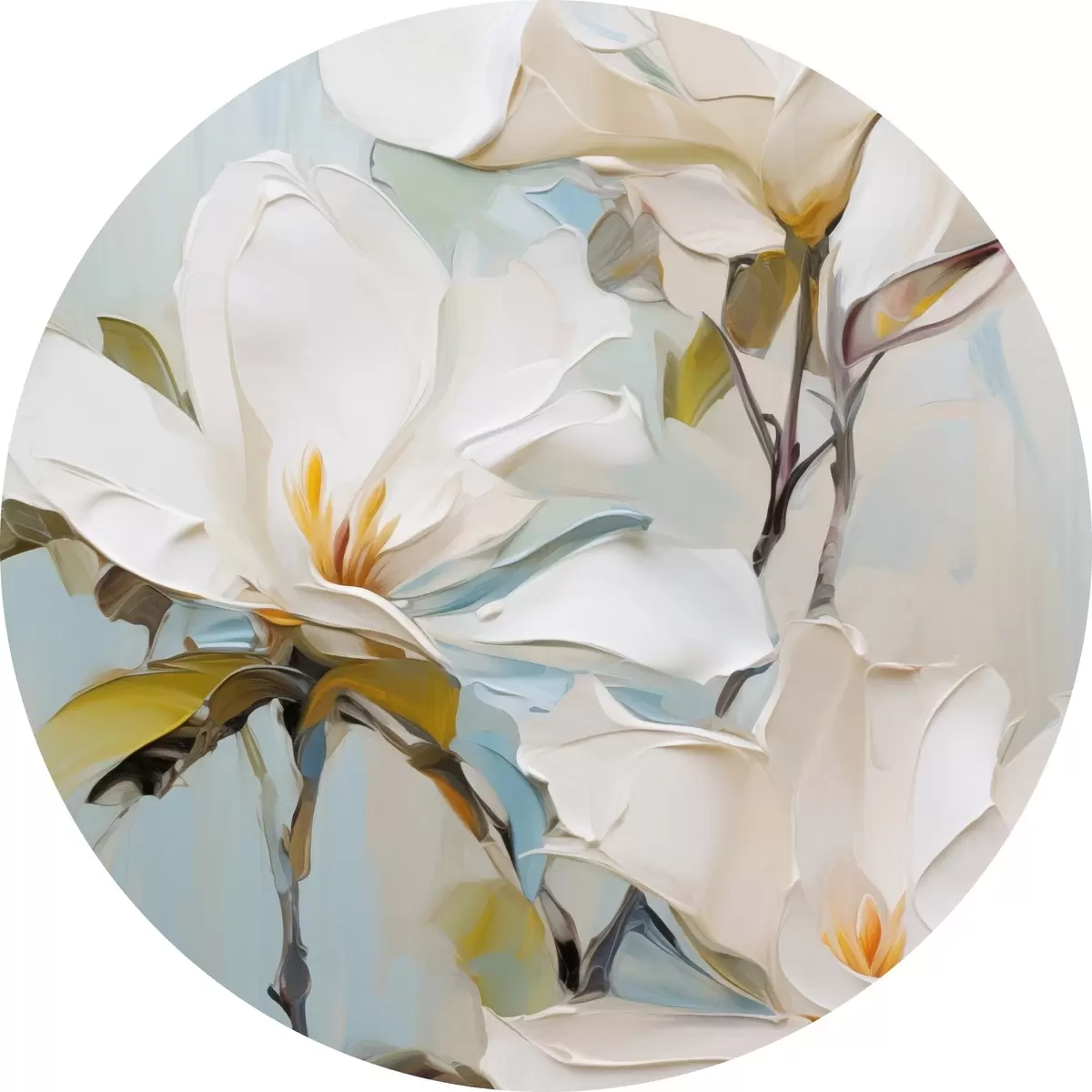 Кругла картина Білі квіти магнолії, світло-блакитний фон з м'якими мазками пензля, стиль олійного живопису, імпасто-текстура Nr r46276
