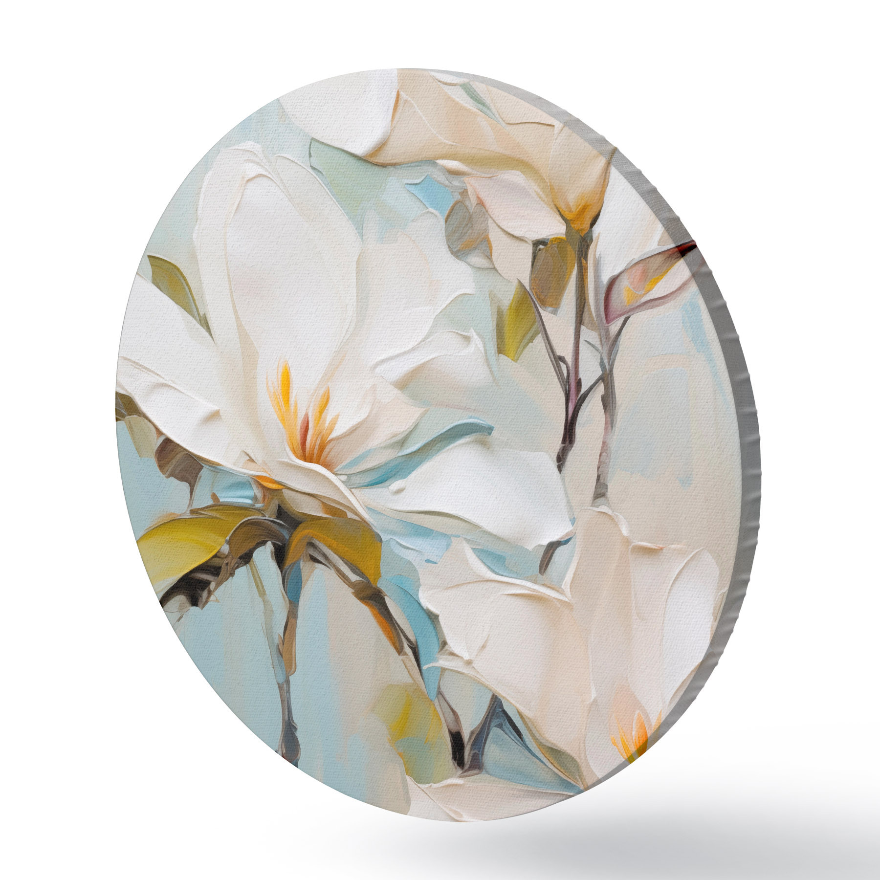 Кругла картина Білі квіти магнолії, світло-блакитний фон з м'якими мазками пензля, стиль олійного живопису, імпасто-текстура r46276