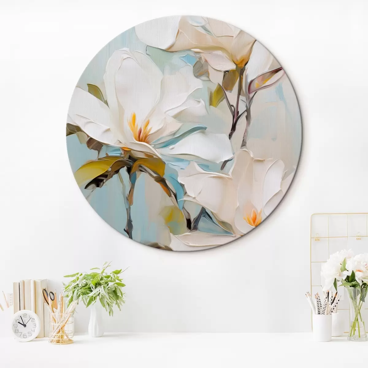 Кругла картина Білі квіти магнолії, світло-блакитний фон з м'якими мазками пензля, стиль олійного живопису, імпасто-текстура Nr r46276