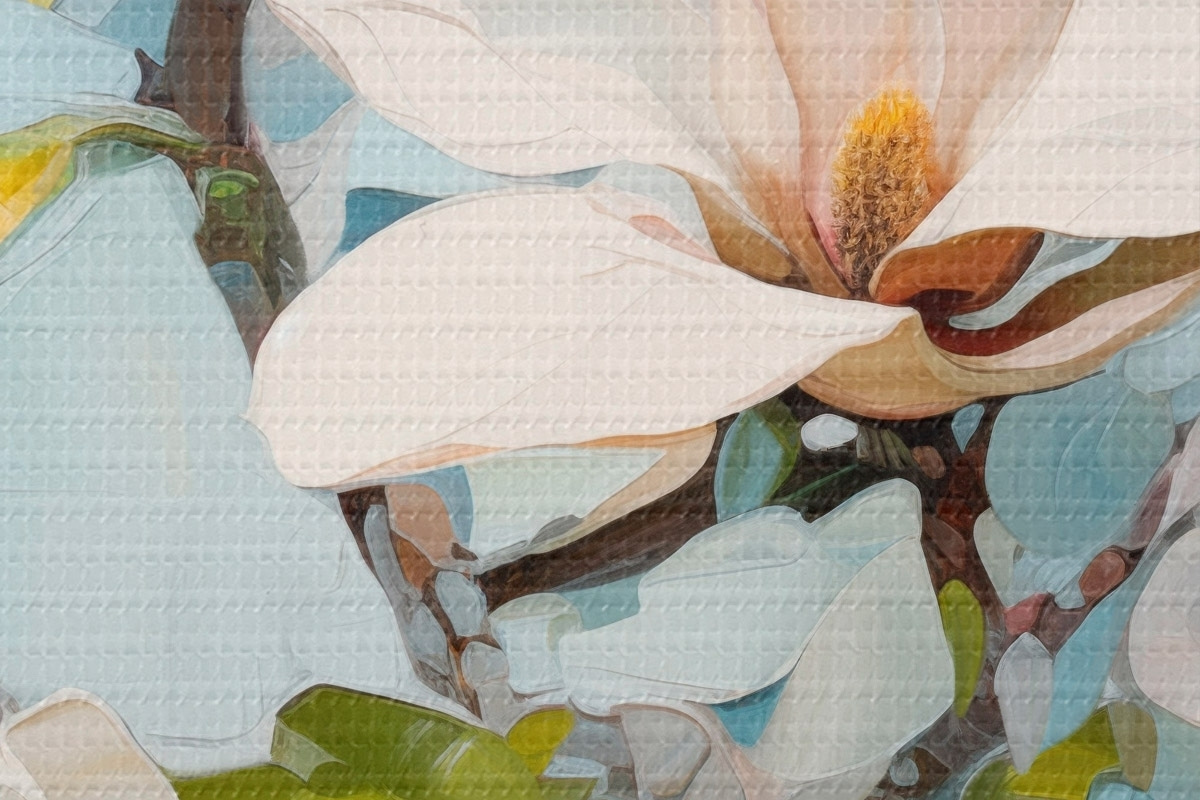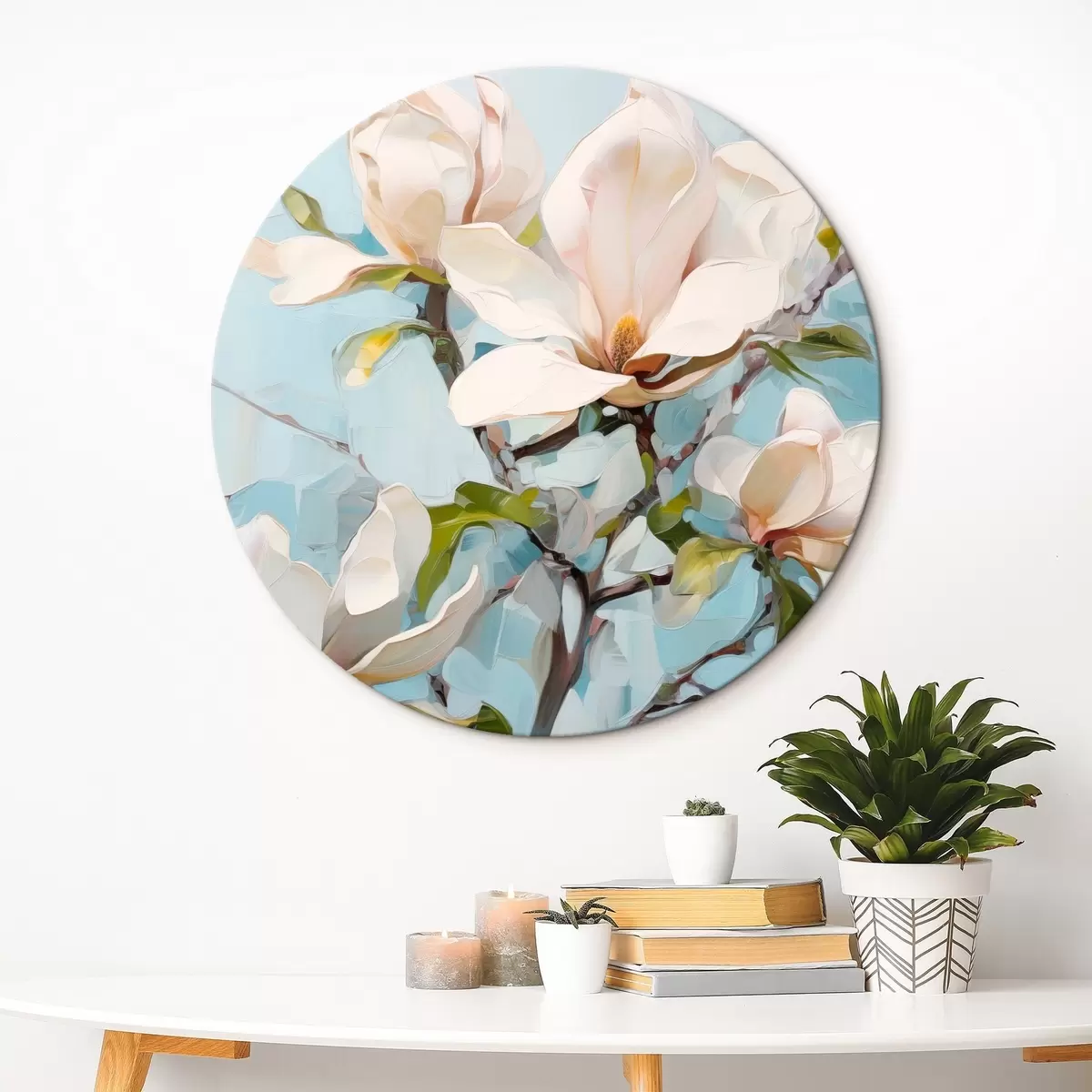 Кругла картина Білі квіти магнолії, світло-блакитний фон з м'якими мазками пензля, стиль олійного живопису, імпасто-текстура Nr r46277