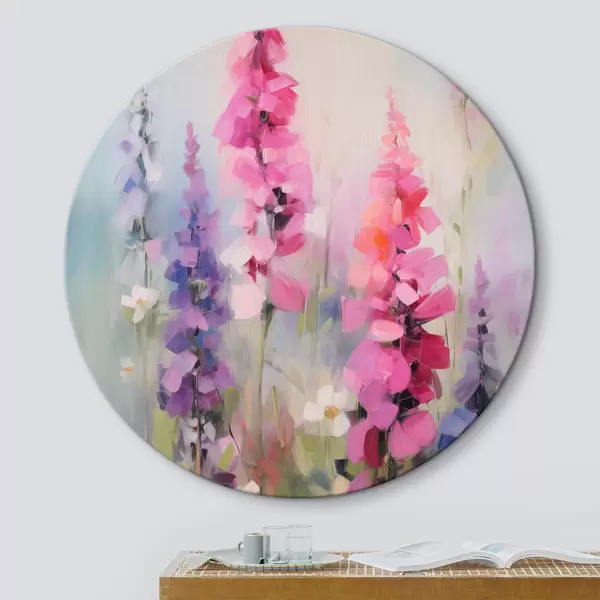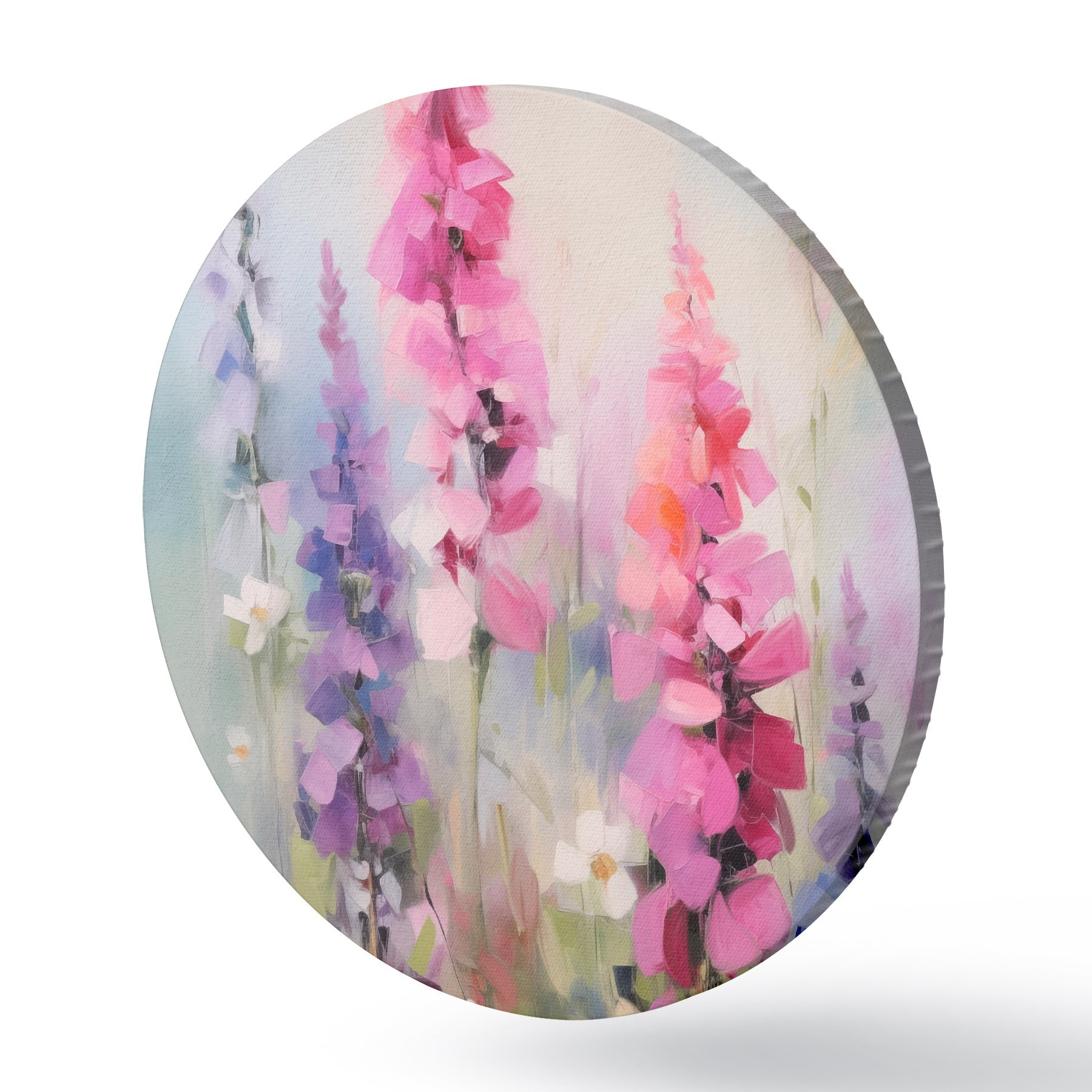 Кругла картина Рожеві та фіолетові квіти з білими маргаритками на полі, м'які мазки пензля, пастельні кольори, імпресіоністичний стиль r46279