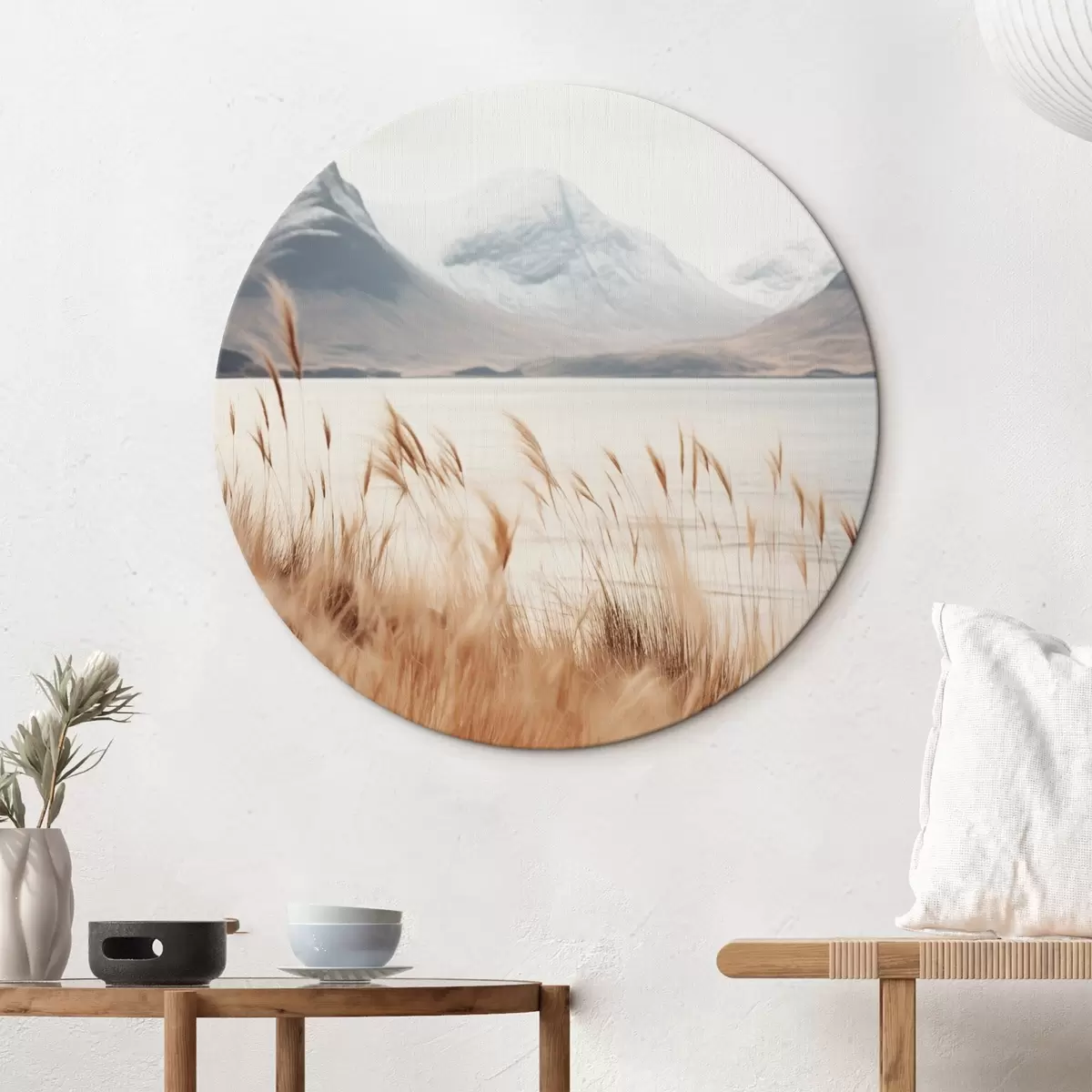 Кругла картина Поле пампасової трави перед озером на тлі засніжених гір, м'яке світло r46282