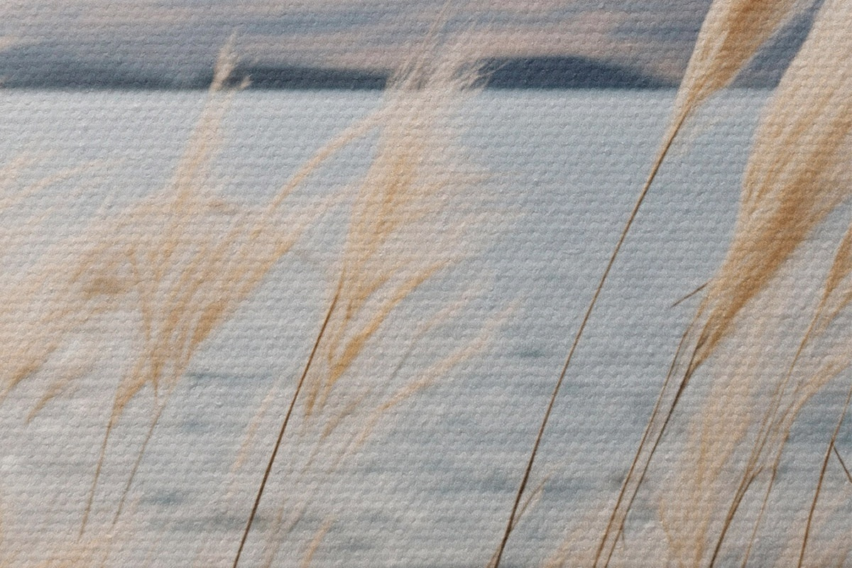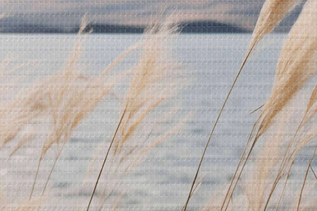 Кругла картина Трава пампас на тлі озера і гір, м'яке освітлення, приглушені кольори, натуралістичний стиль r46283