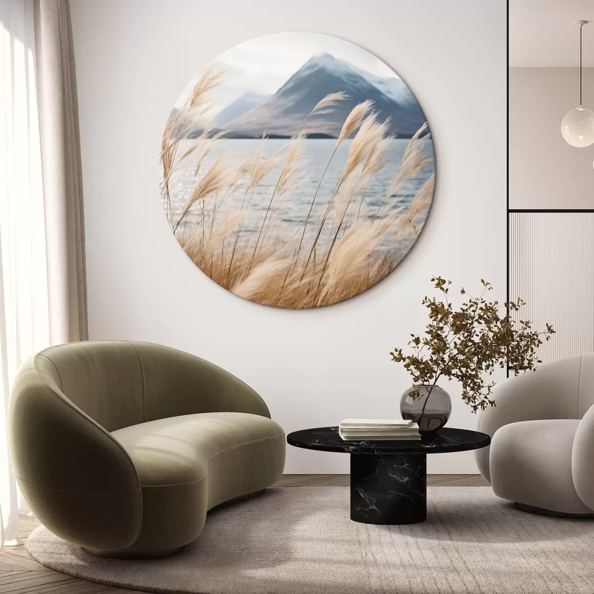 Кругла картина Трава пампас на тлі озера і гір, м'яке освітлення, приглушені кольори, натуралістичний стиль r46283