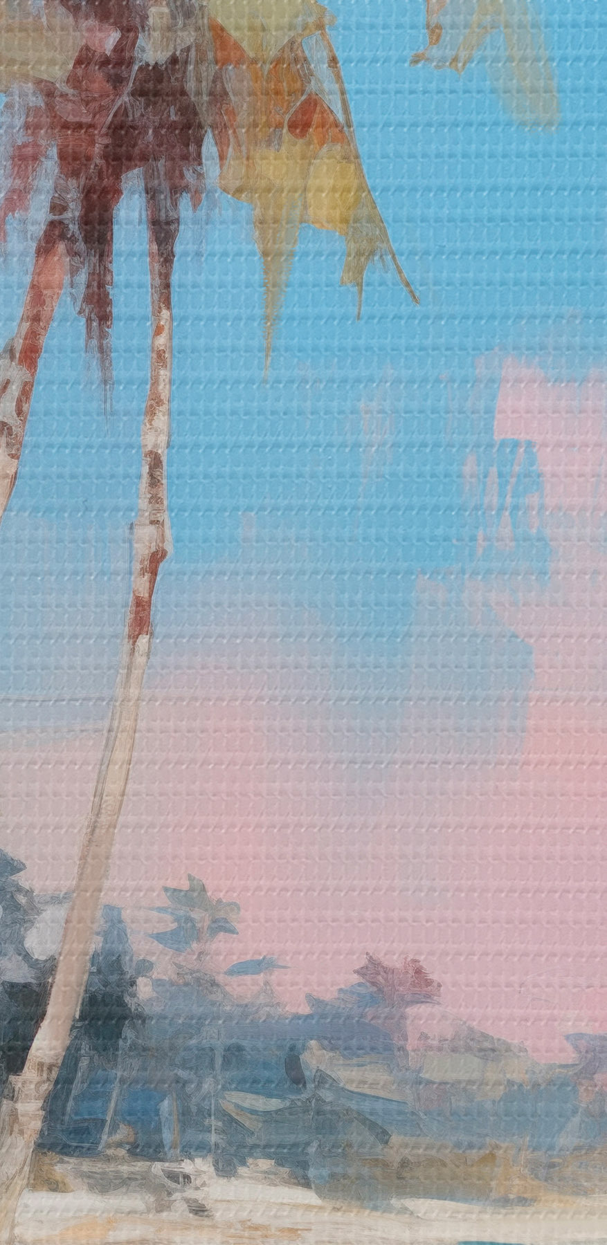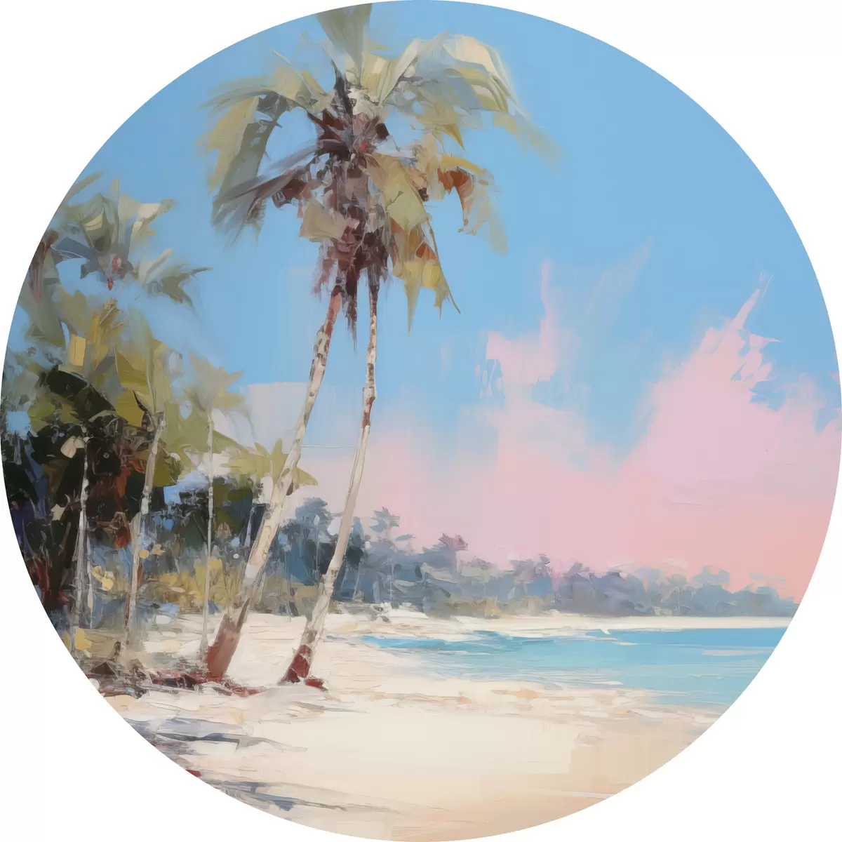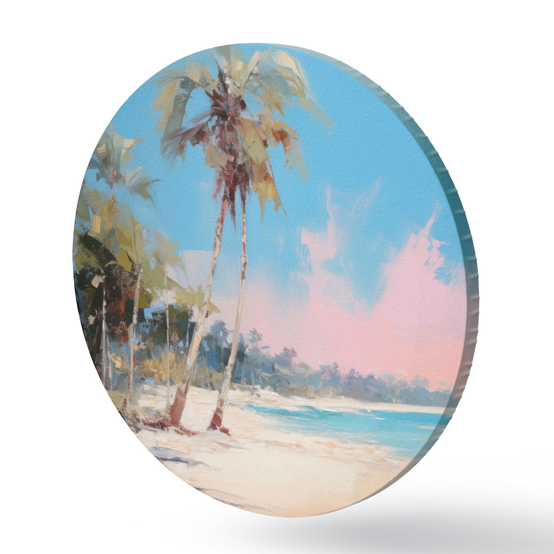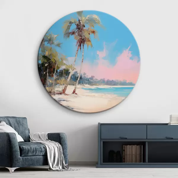 Кругла картина Абстрактний тропічний пляж з білим піском і пальмами, блакитне небо з білими хмарами Nr r46285