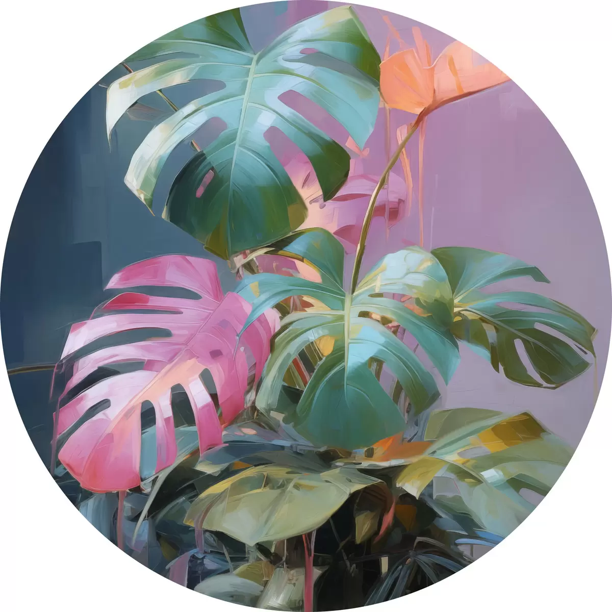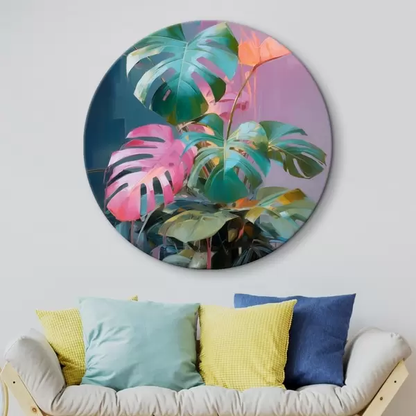 Кругла картина Абстрактна рослина монстера з рожевими та зеленими листям, яскравими кольорами, на розмитому тлі Nr r46287