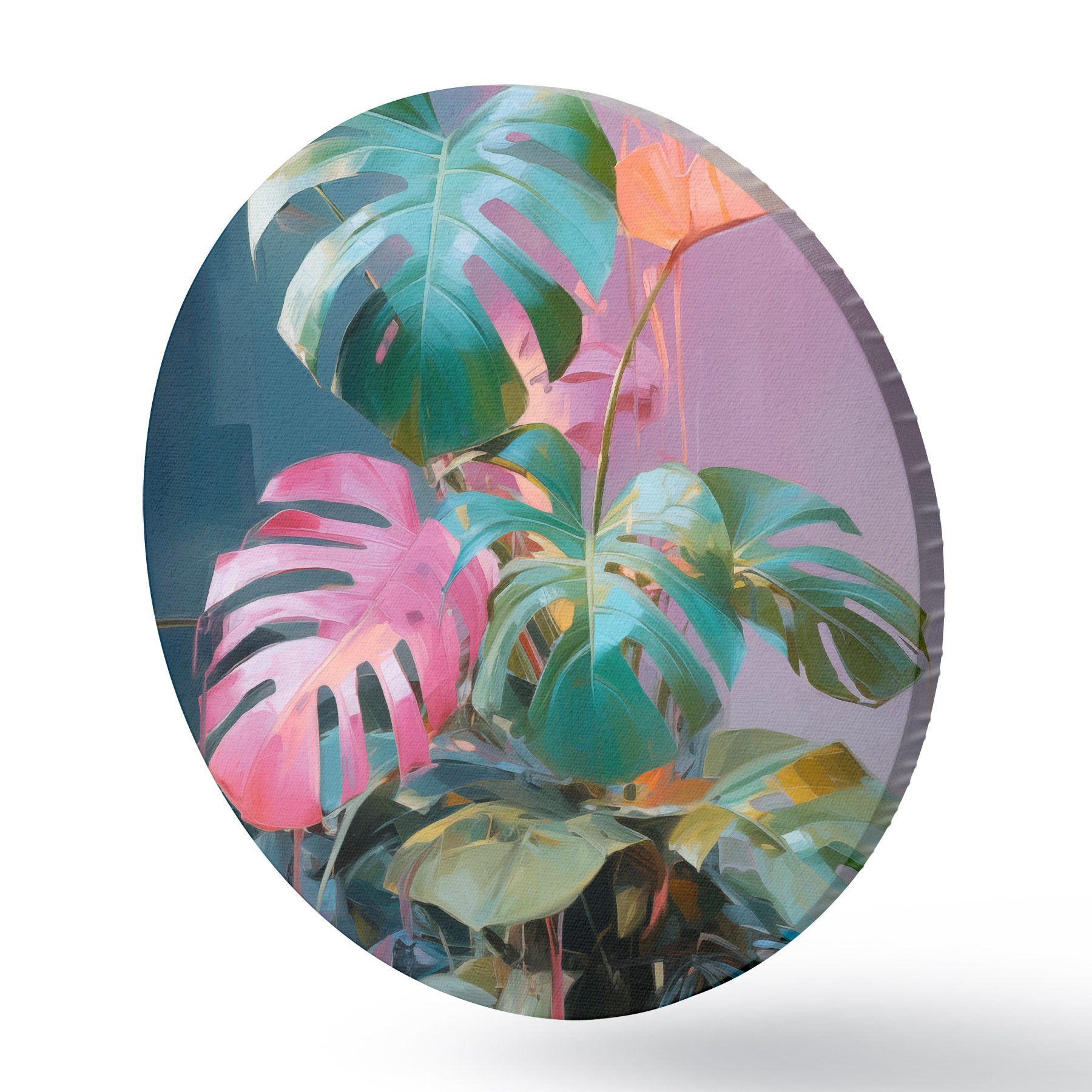 Кругла картина Абстрактна рослина монстера з рожевими та зеленими листям, яскравими кольорами, на розмитому тлі r46287