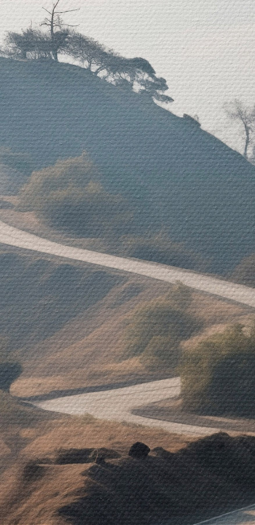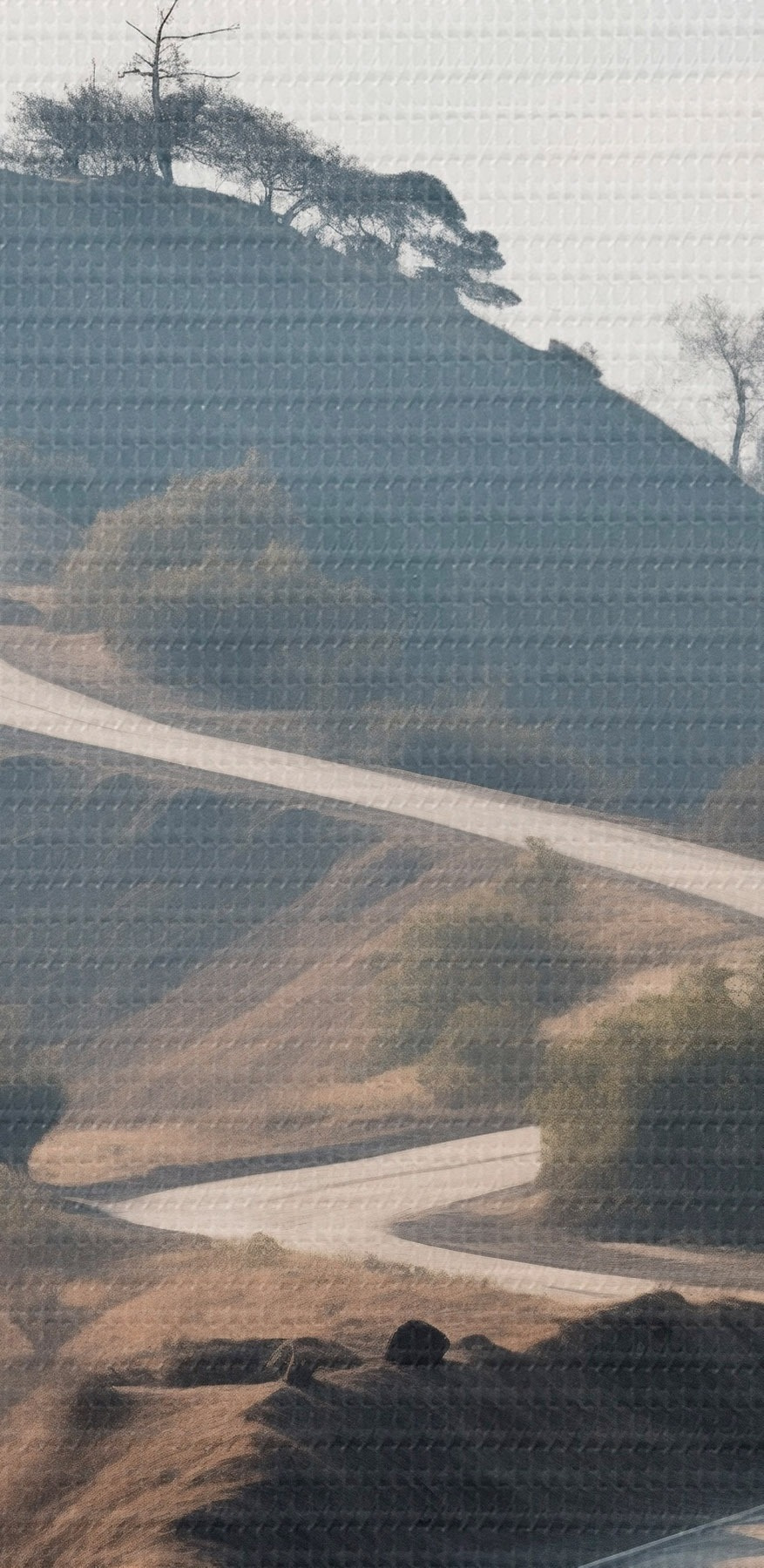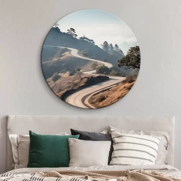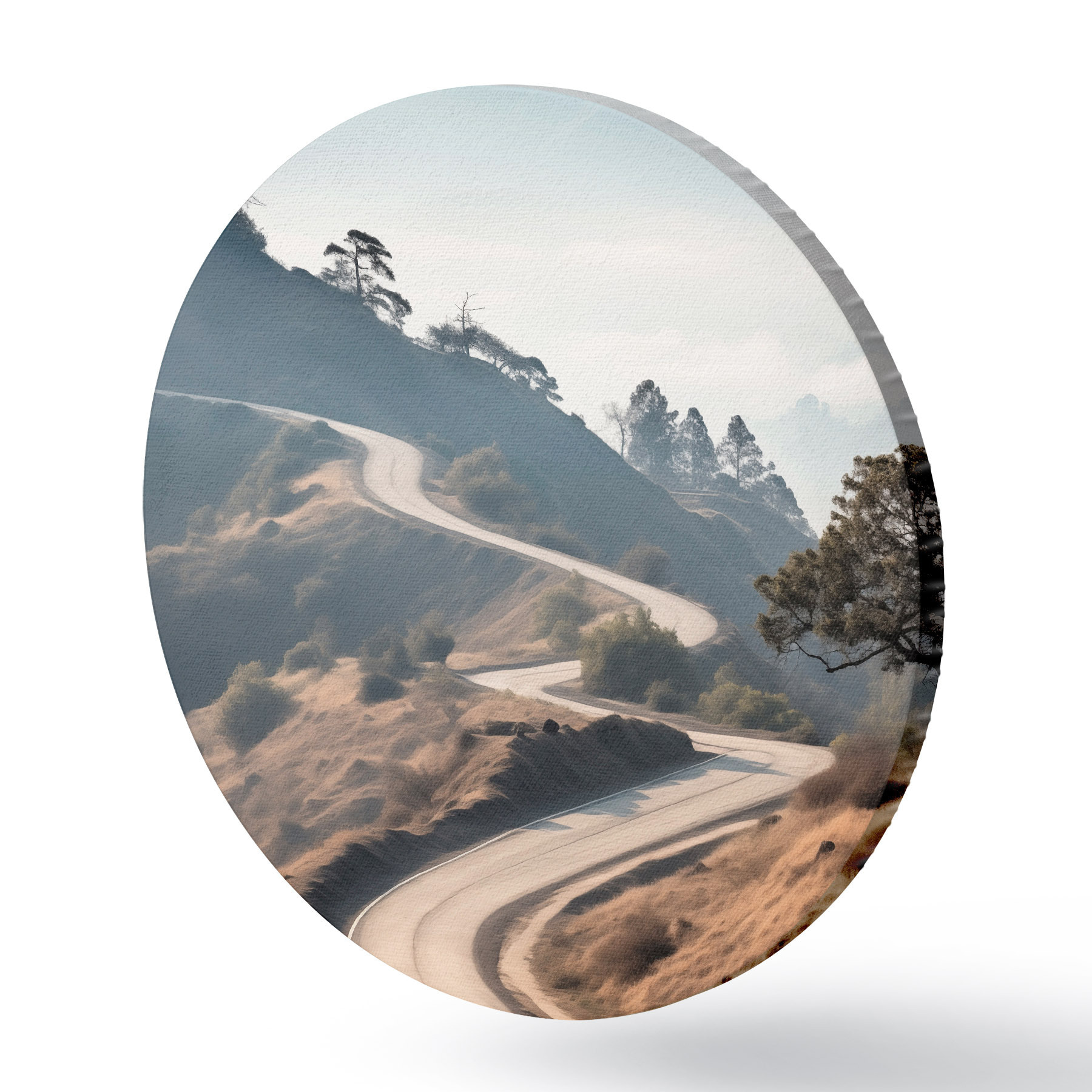 Кругла картина Звивиста дорога через горбистий ландшафт з сухою травою під чистим небом, а вдалині видніються гори Nr r46289
