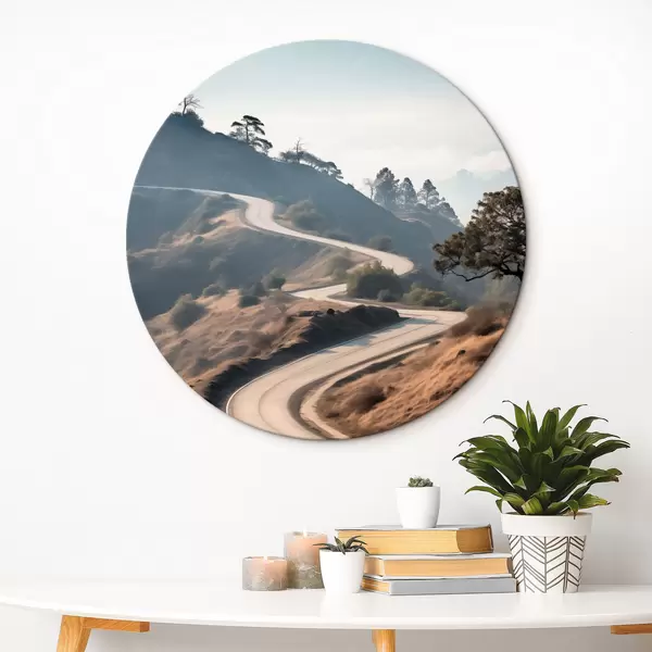 Кругла картина Звивиста дорога через горбистий ландшафт з сухою травою під чистим небом, а вдалині видніються гори r46289