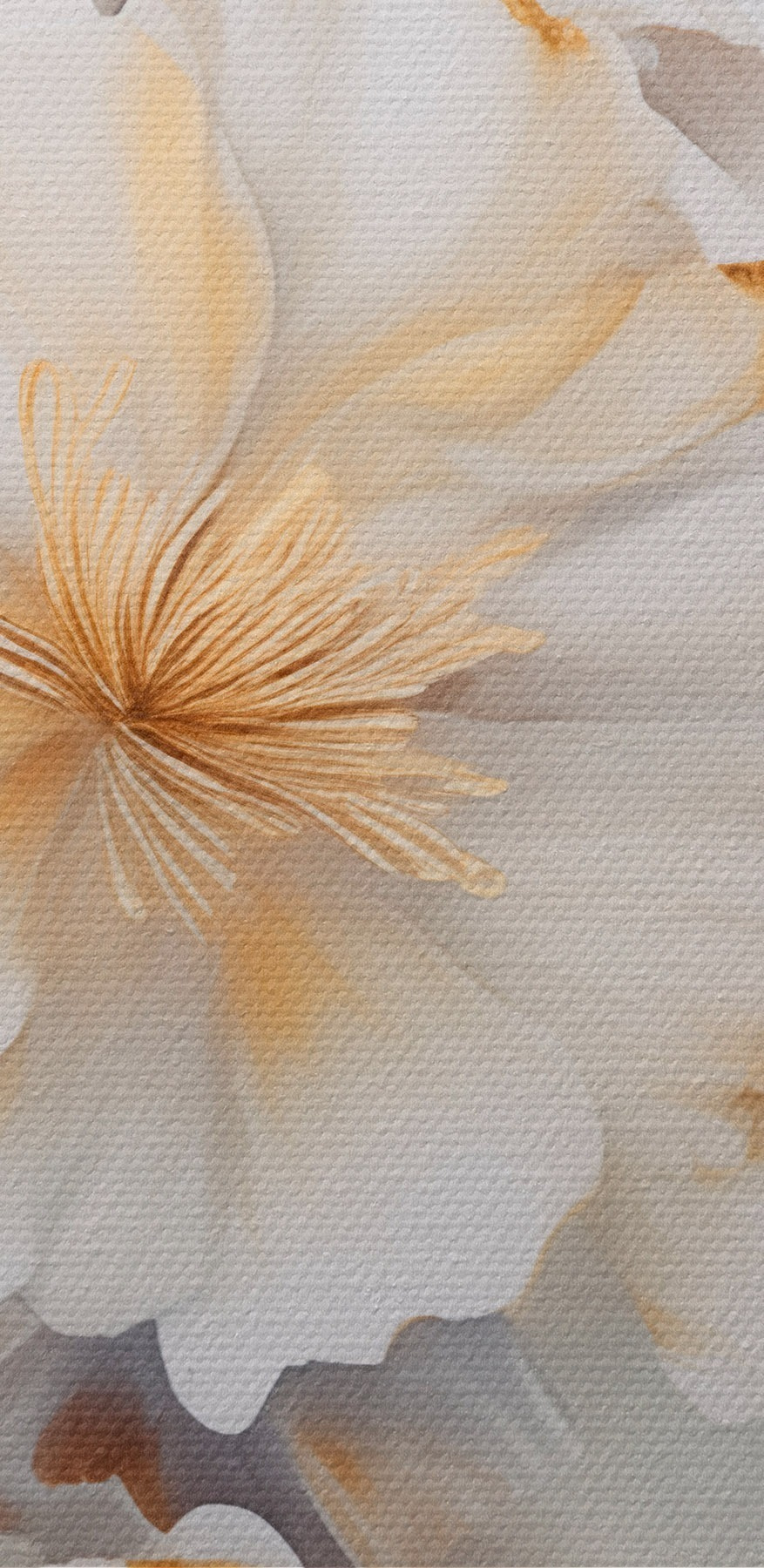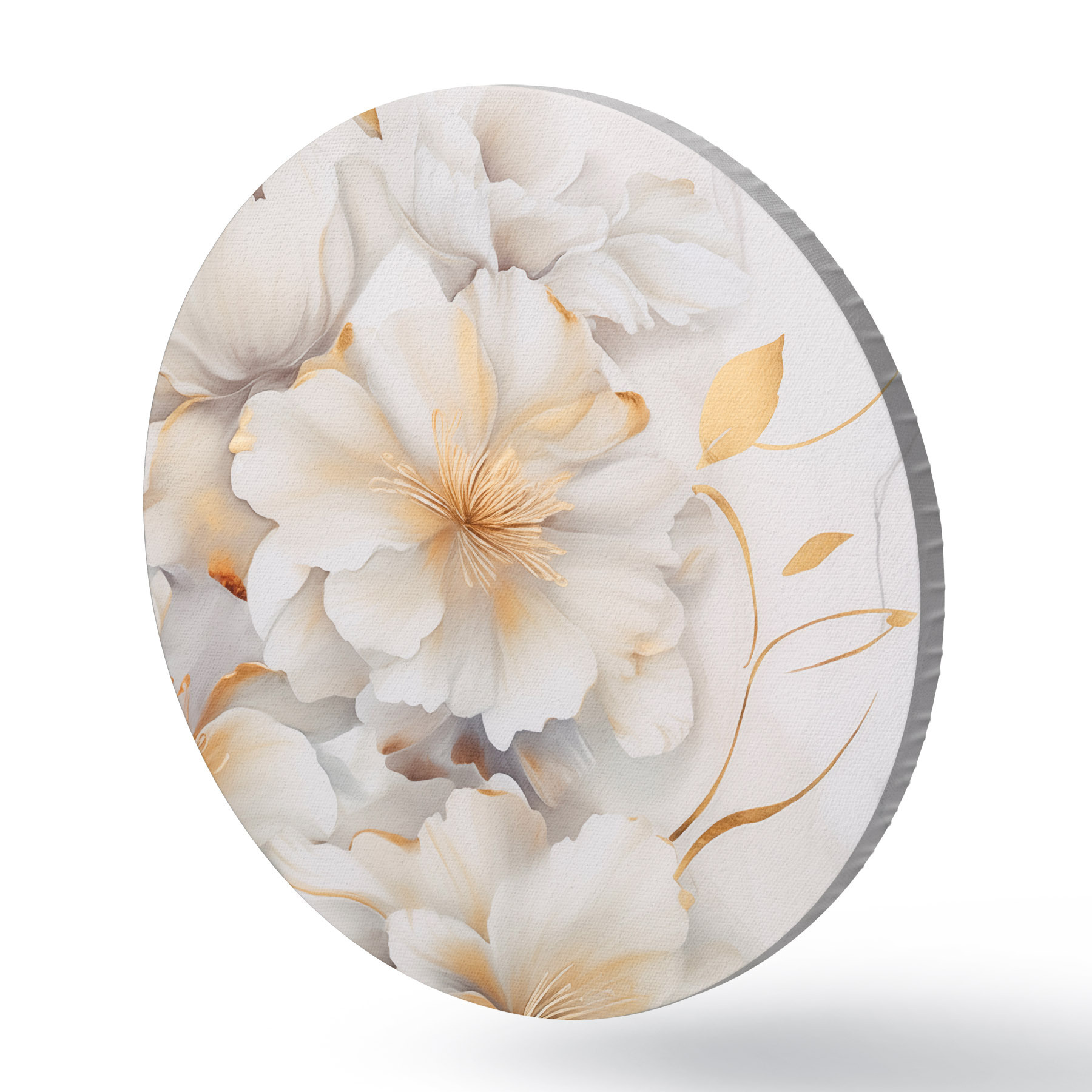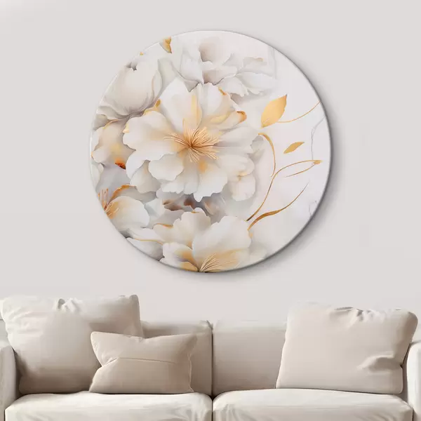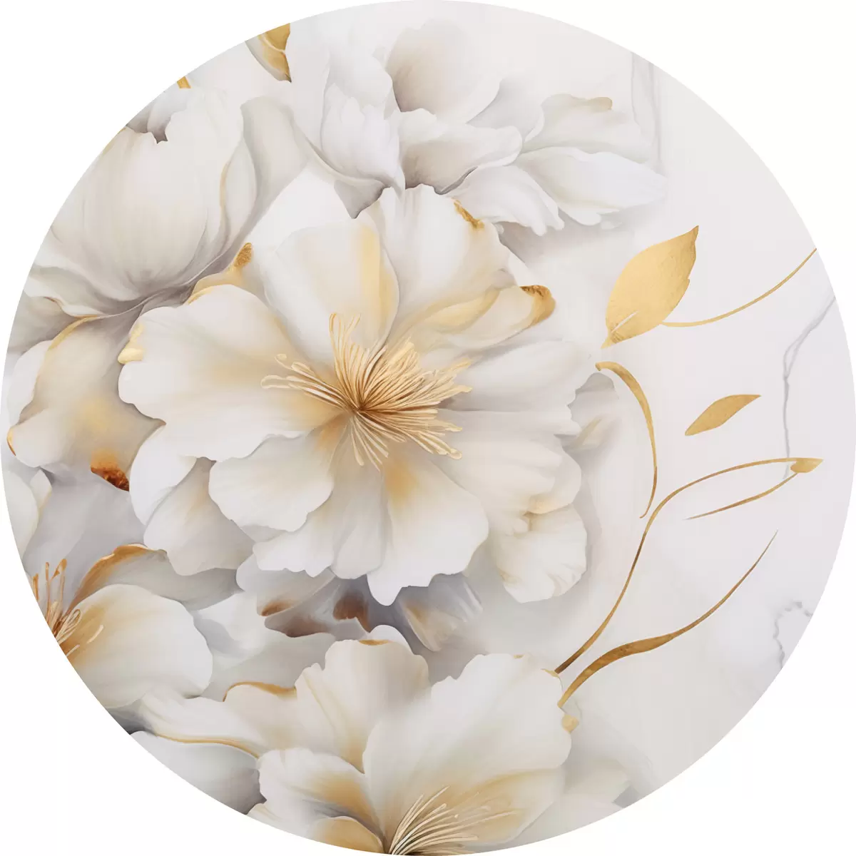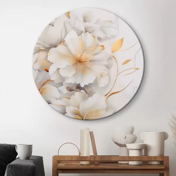 Кругла картина Білі квіти з жовтими деталями, пелюстки з легкими тінями, світлий фон з легким мармуровим ефектом Nr r46292