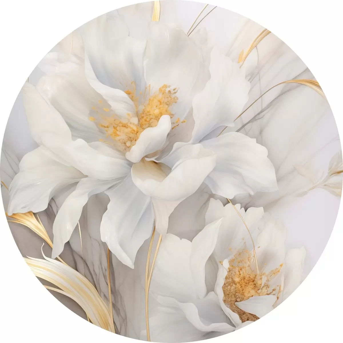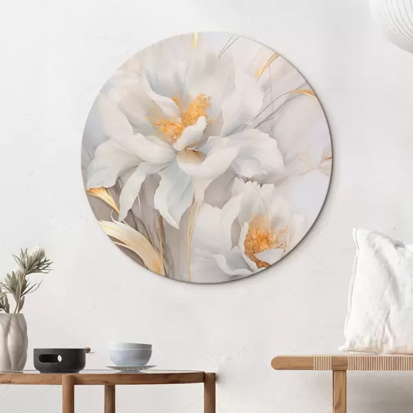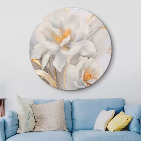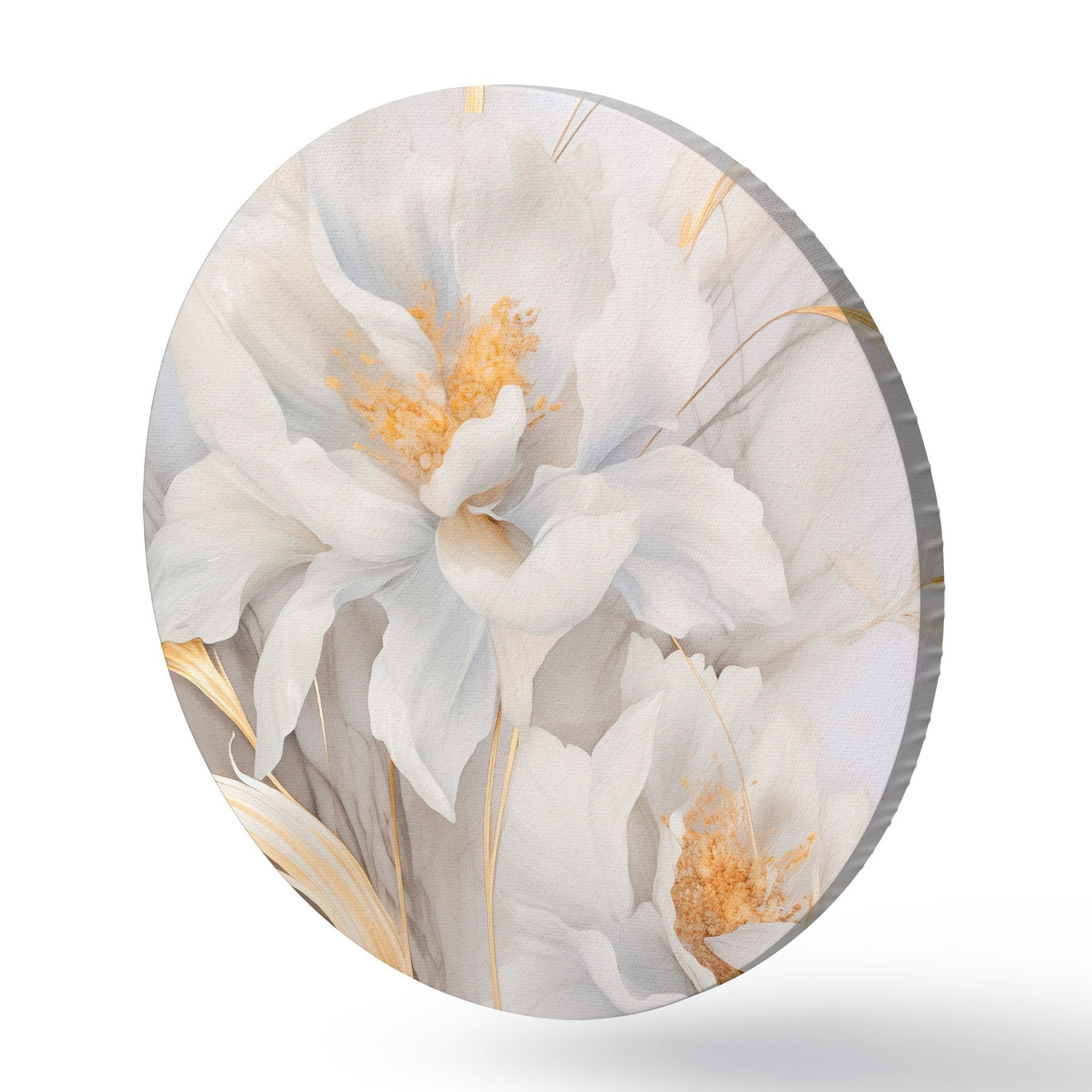 Кругла картина Білі квіти з жовтими маточками і стеблами, ніжні пелюстки, витончена композиція, нейтральний фон Nr r46293