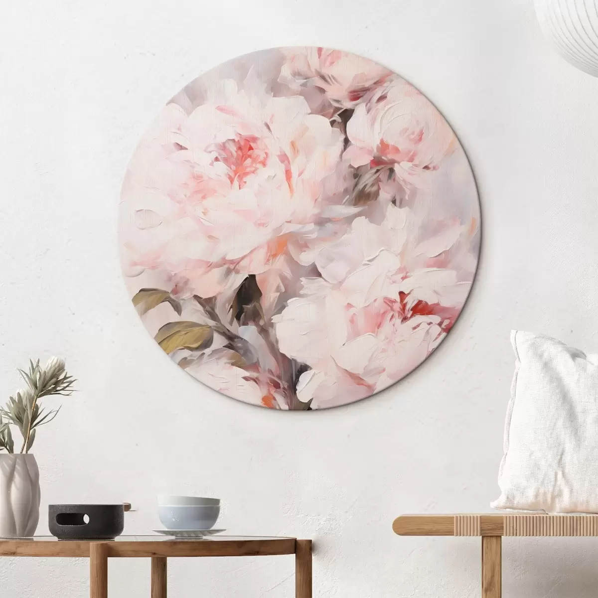 Кругла картина Букет світло-рожевих півоній із зеленим листям, м'які мазки, пастельні кольори, на світлому тлі r46294