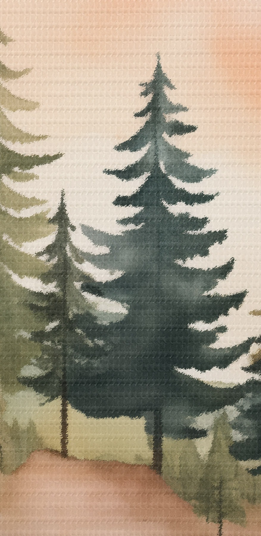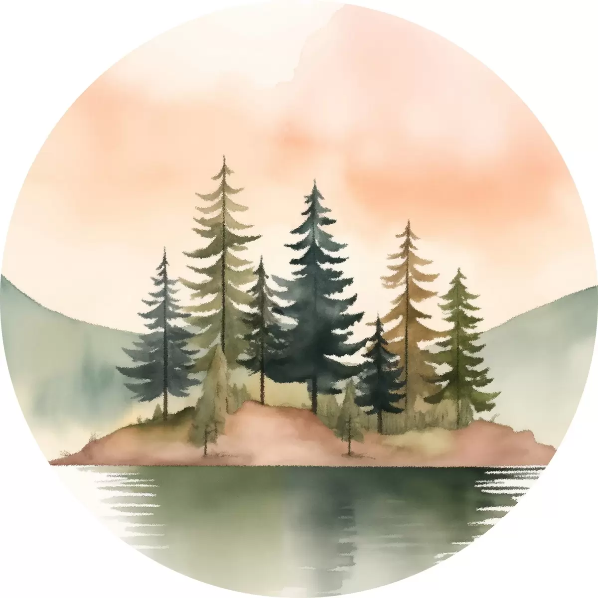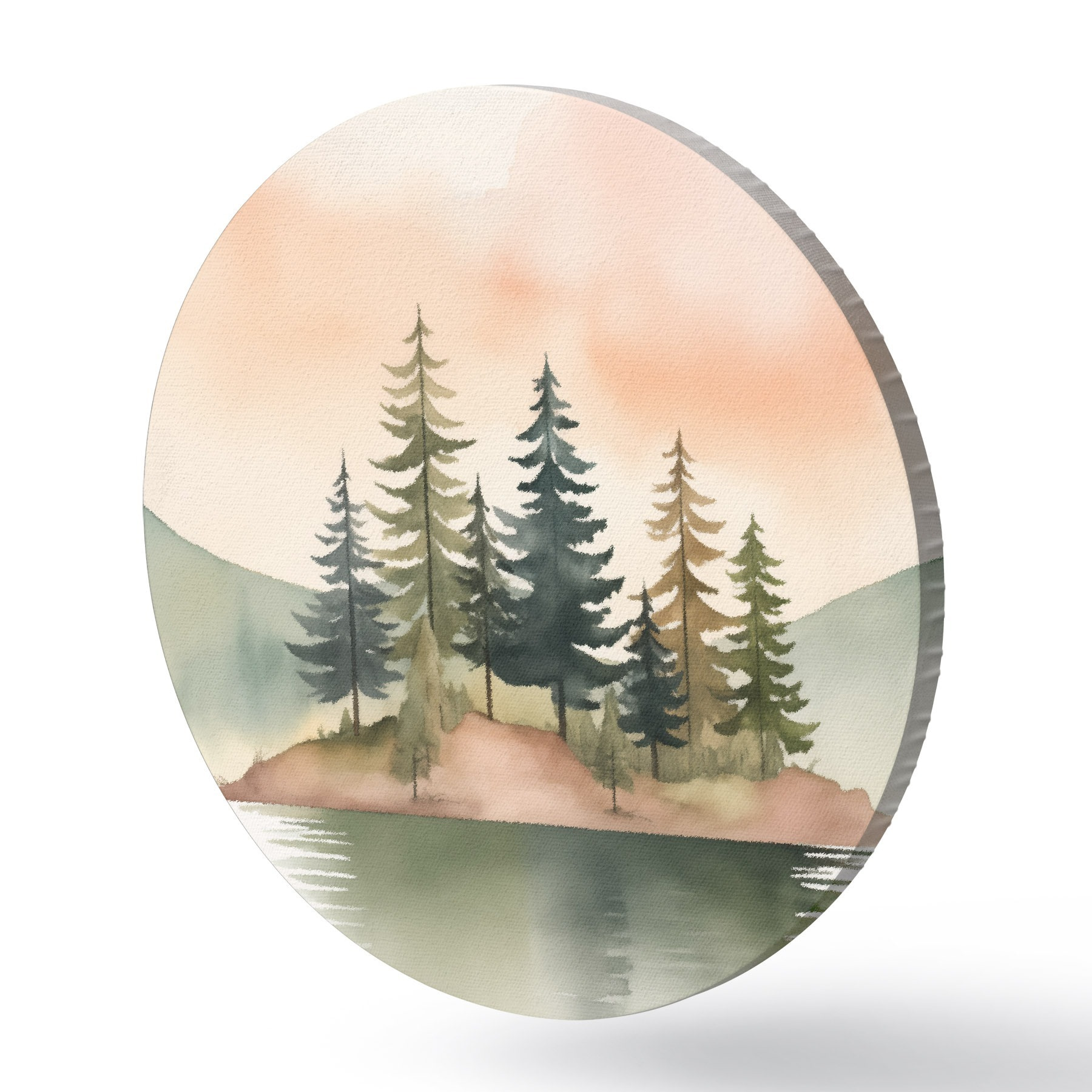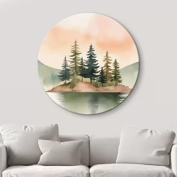 Кругла картина Акварельні сосни на туманному острівці, м'яке персикове небо r46505