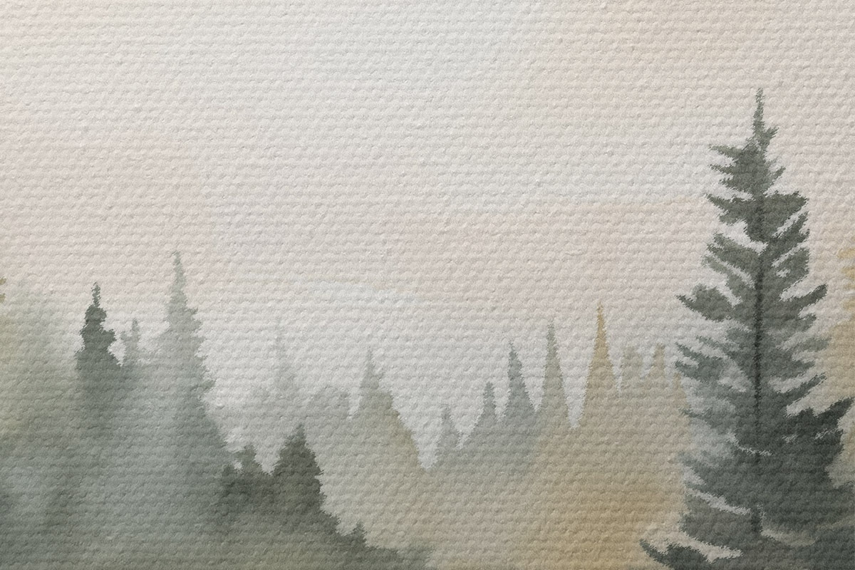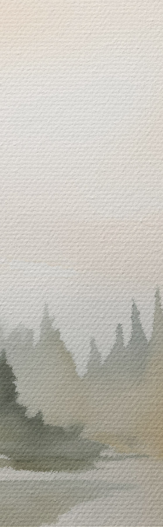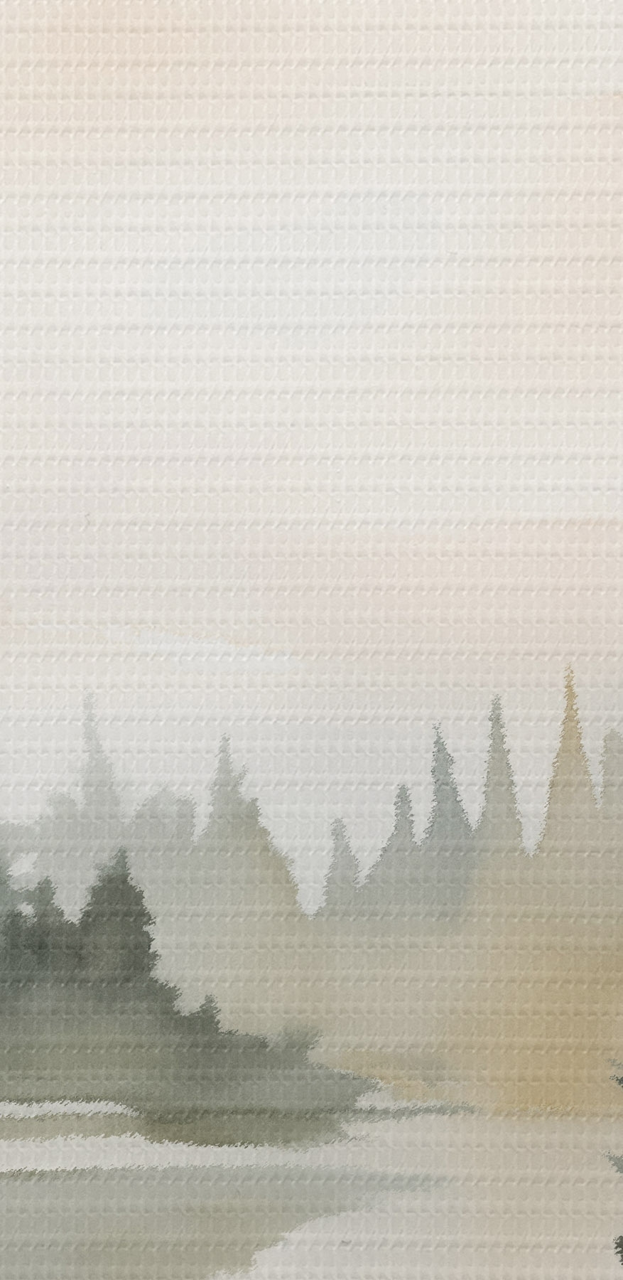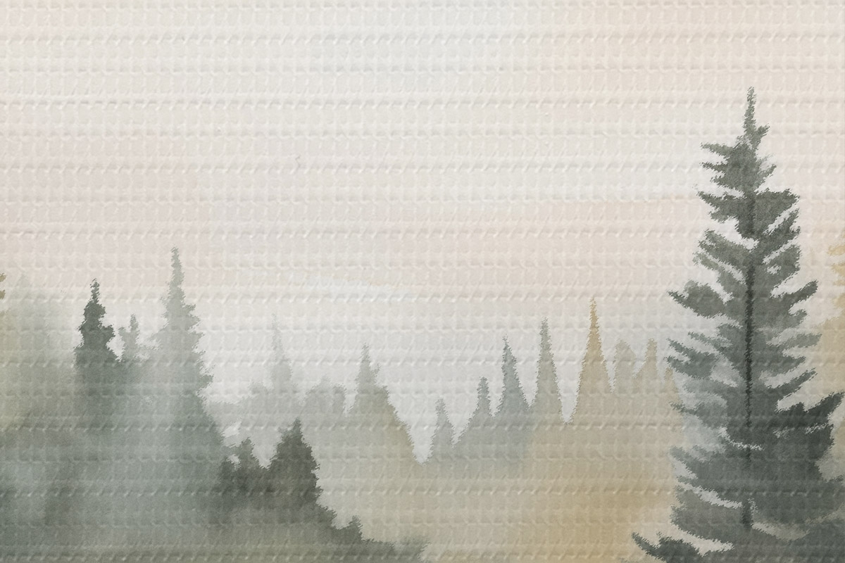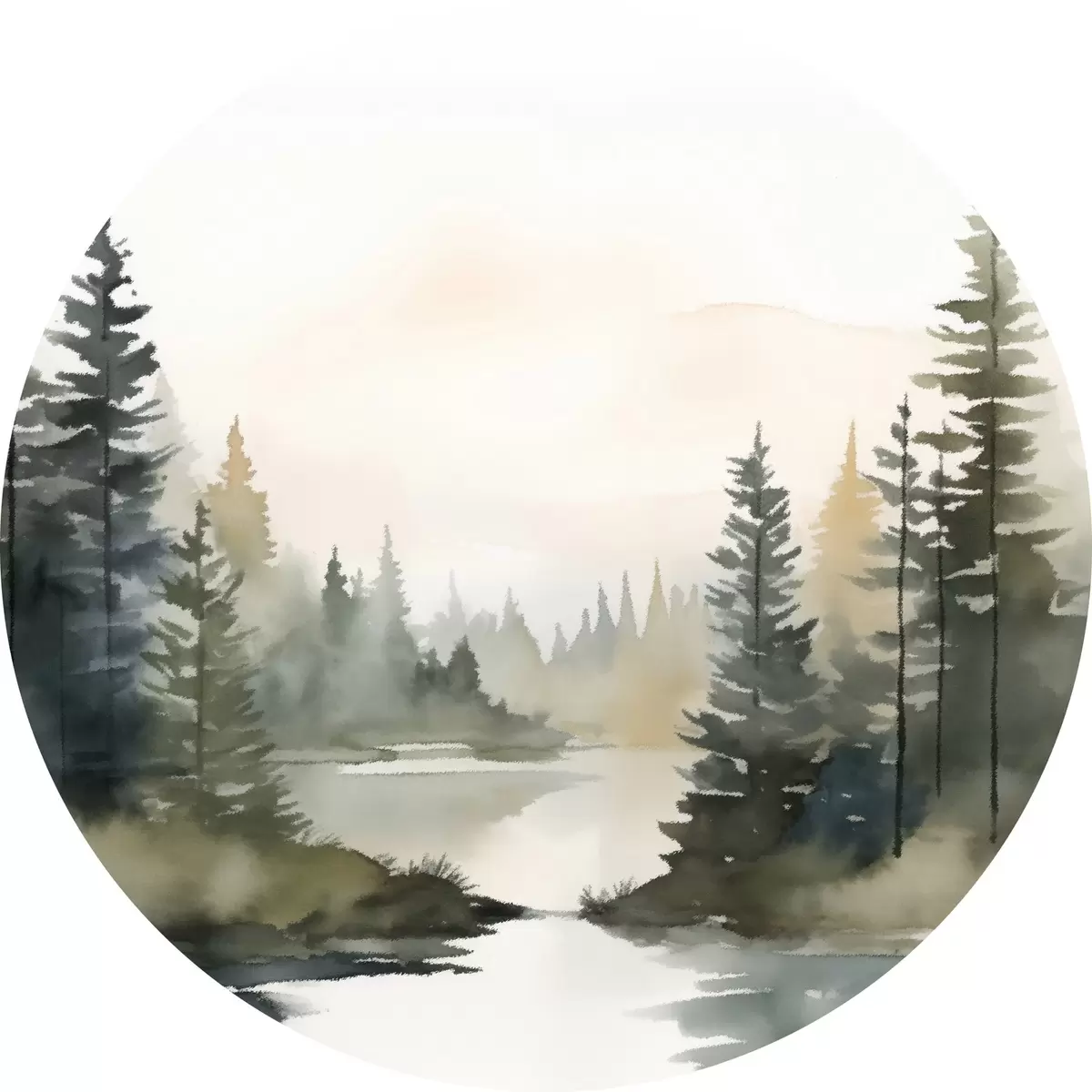 Кругла картина Туманний хвойний ліс над спокійною річкою, акварельний стиль r46507