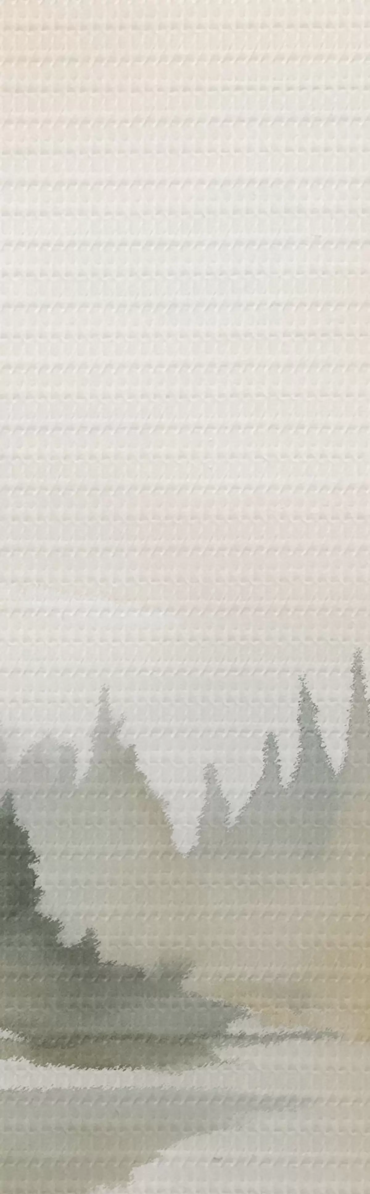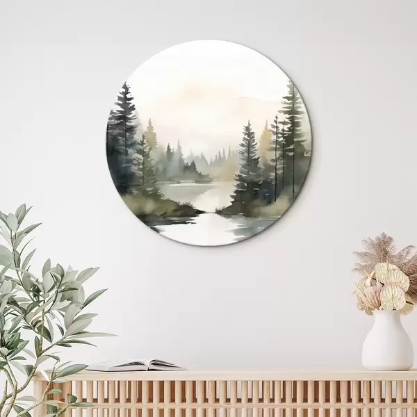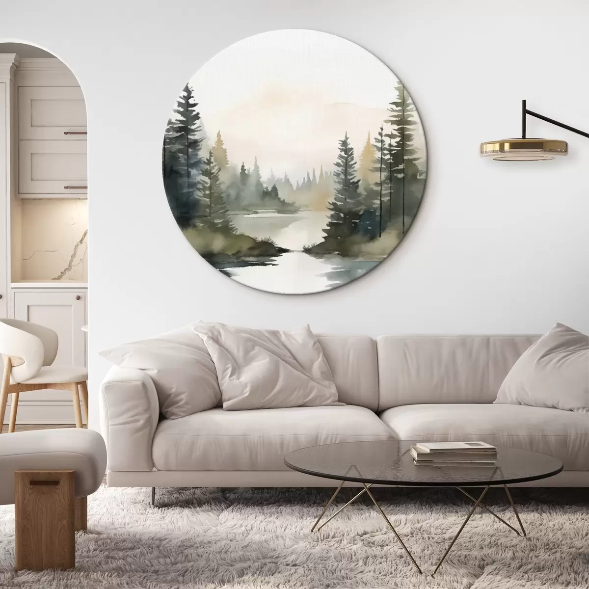 Кругла картина Туманний хвойний ліс над спокійною річкою, акварельний стиль Nr r46507
