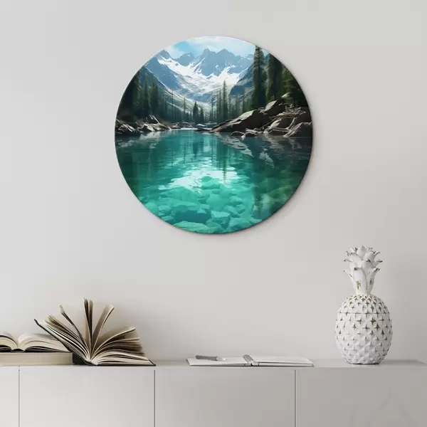 Кругла картина Чиста альпійська річка з кам'янистим дном і засніженими вершинами Nr r46514