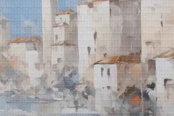 Кругла картина Абстрактні будинки біля затоки імітація живопису r46673