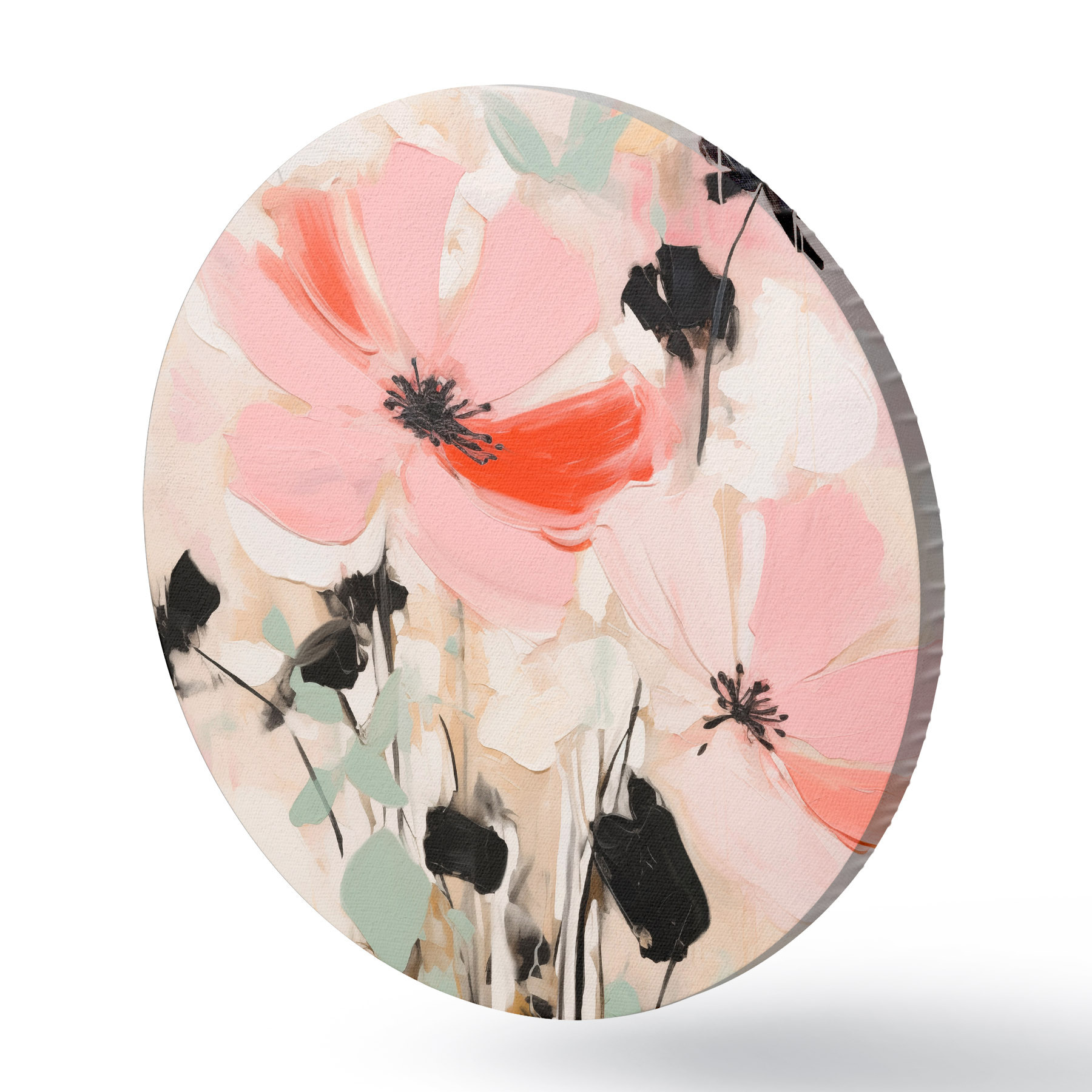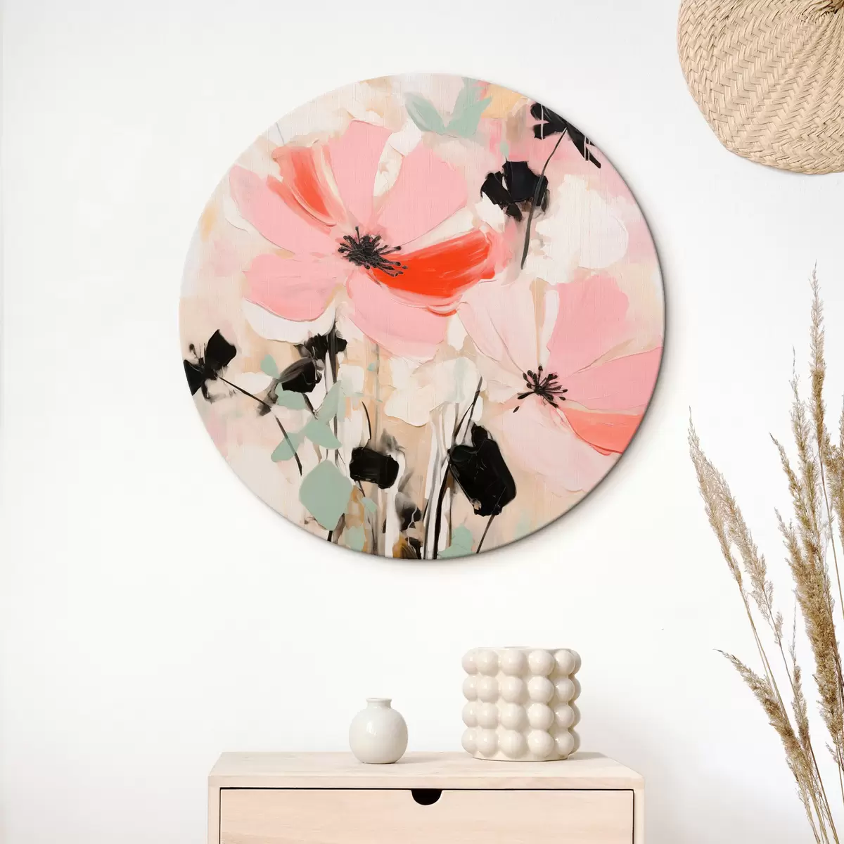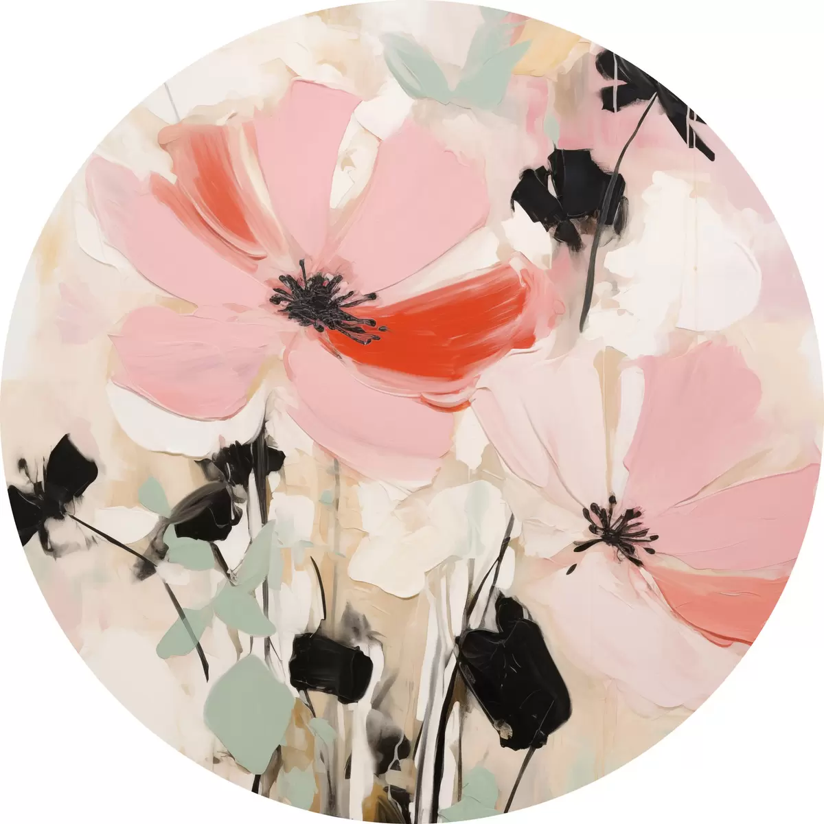 Кругла картина Рожеві та чорні квіти з листям, м'які пастельні кольори, абстрактна квіткова композиція, мінімалістичне мистецтво Nr r46687