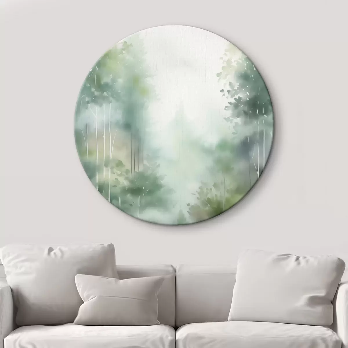 Кругла картина Акварельний малюнок, що імітує абстрактний ліс з високими деревами та зеленим листям, м'які приглушені кольори r46689